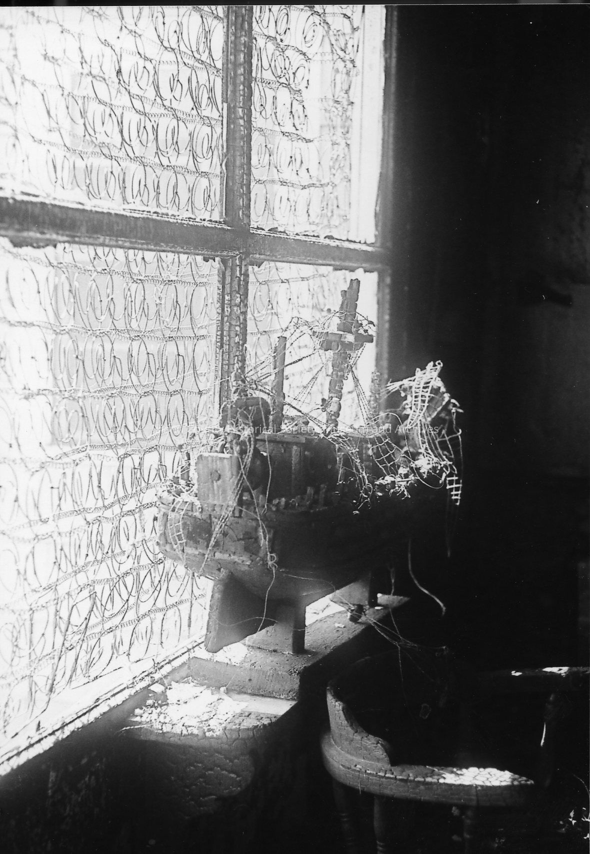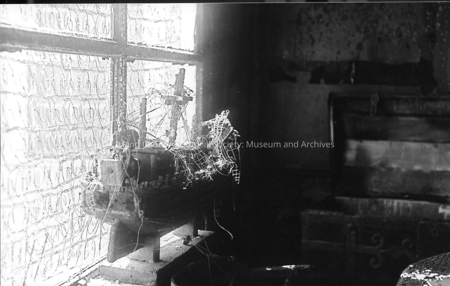 Aftermath of 1968 fire which destroyed the Blockhouse Inn (aka State Hotel and Starwanna Hotel), which stood where Island County Historical Museum now stands. A model of a ship sits on a table in front of a window. A trunk is visible with the edge of a scorched table and chair in front.Photograph Details