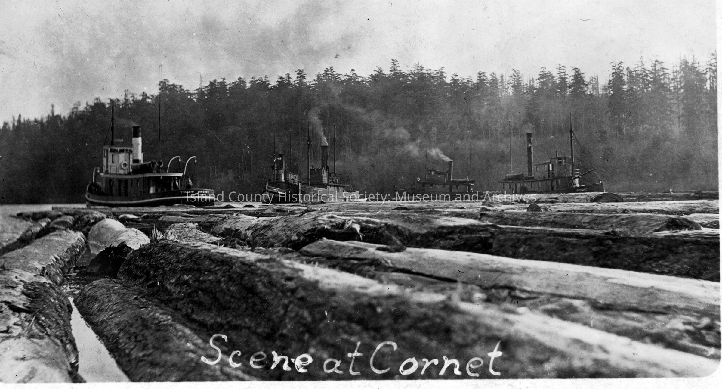 Boats and logs in Cornet Bay. Logging and steamers.