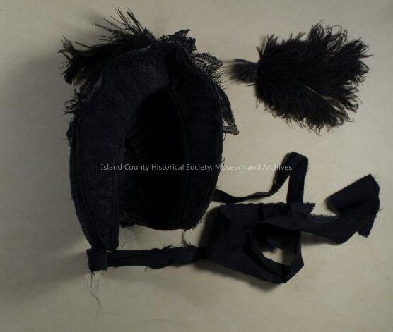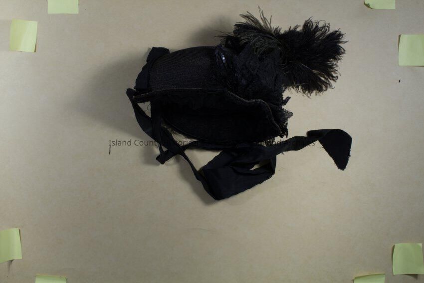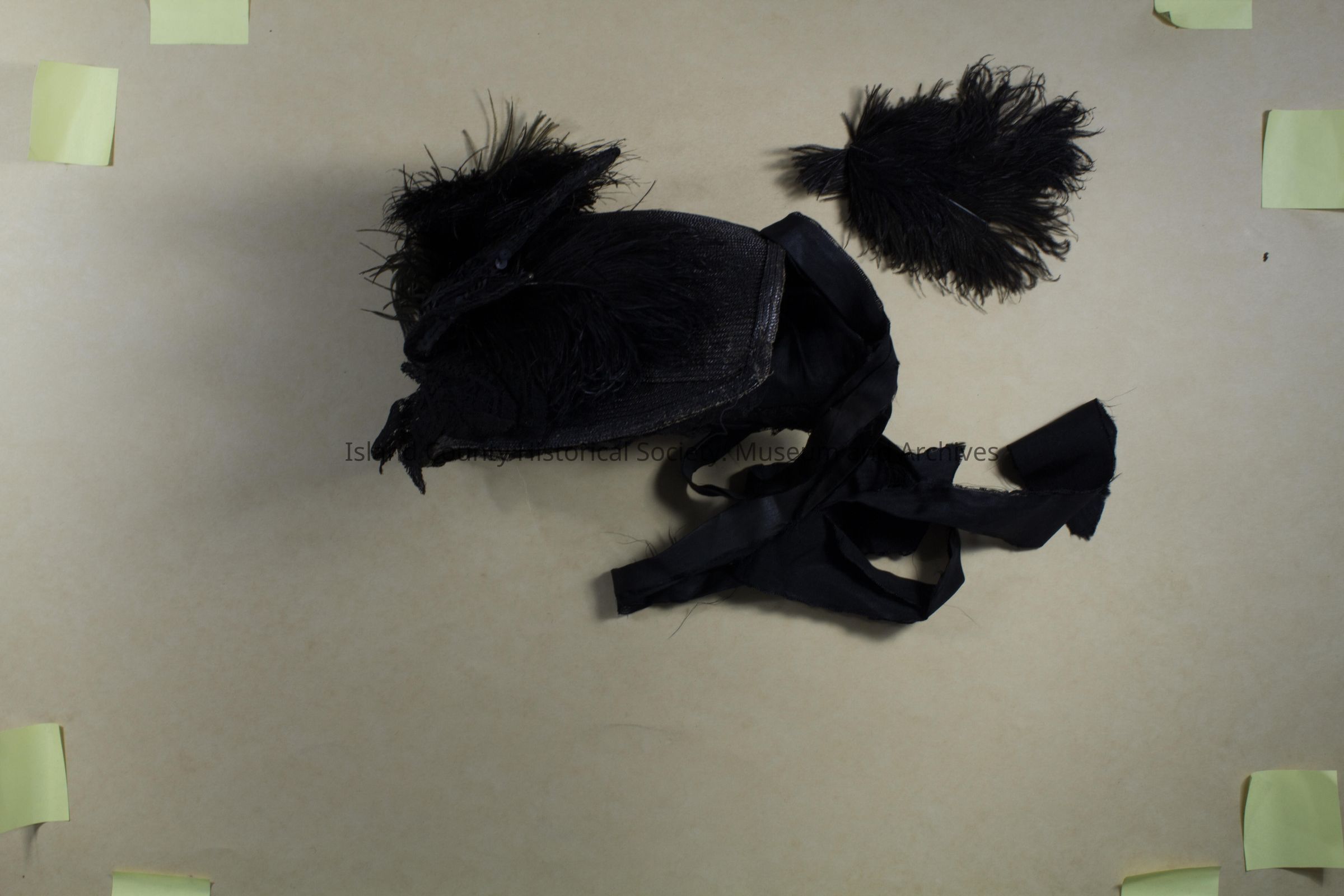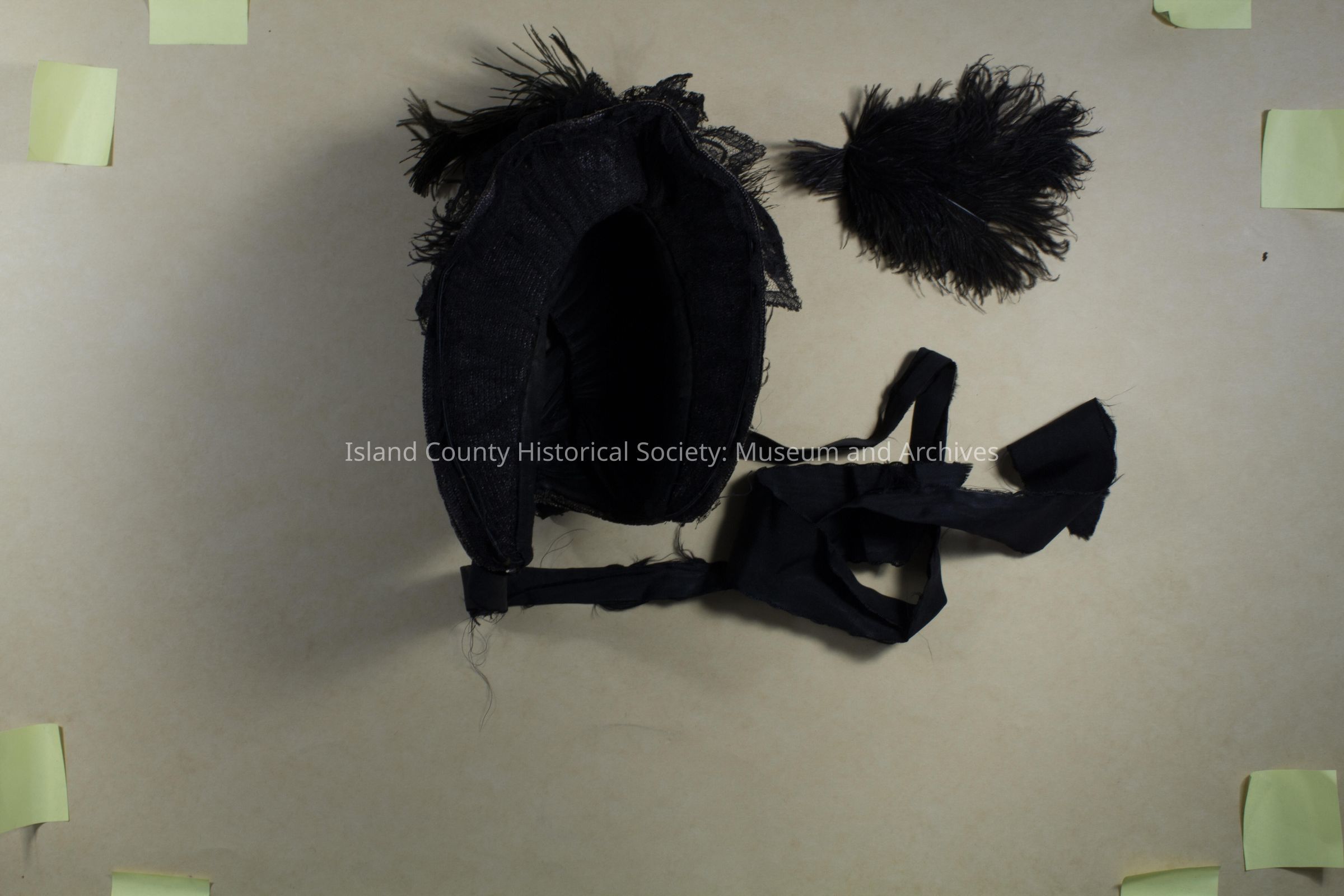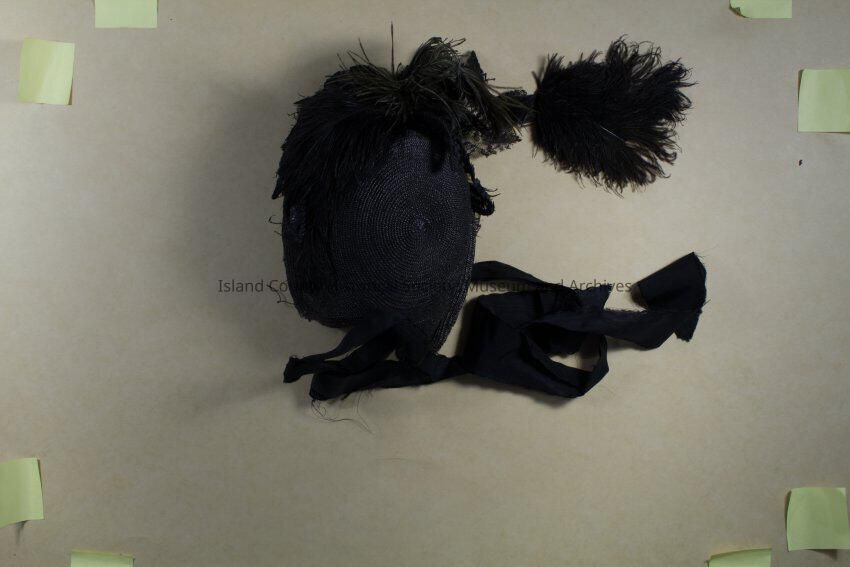 Black straw bonnet with feathers. Sits at the back of the head. Delicate condition. Two silken straps to tie around the neck beneath the chin. Lace around the rim of the bonnet (fraying). One strap is slightly detached. Rim part of the bonnet has separated from rounded part towards the top. Some feathers have become bleached due to age and use. Intermingled with the feathers is a feather-shaped lace decoration with sequins sewn on. Satin-like lining inside the bonnet, ruched.