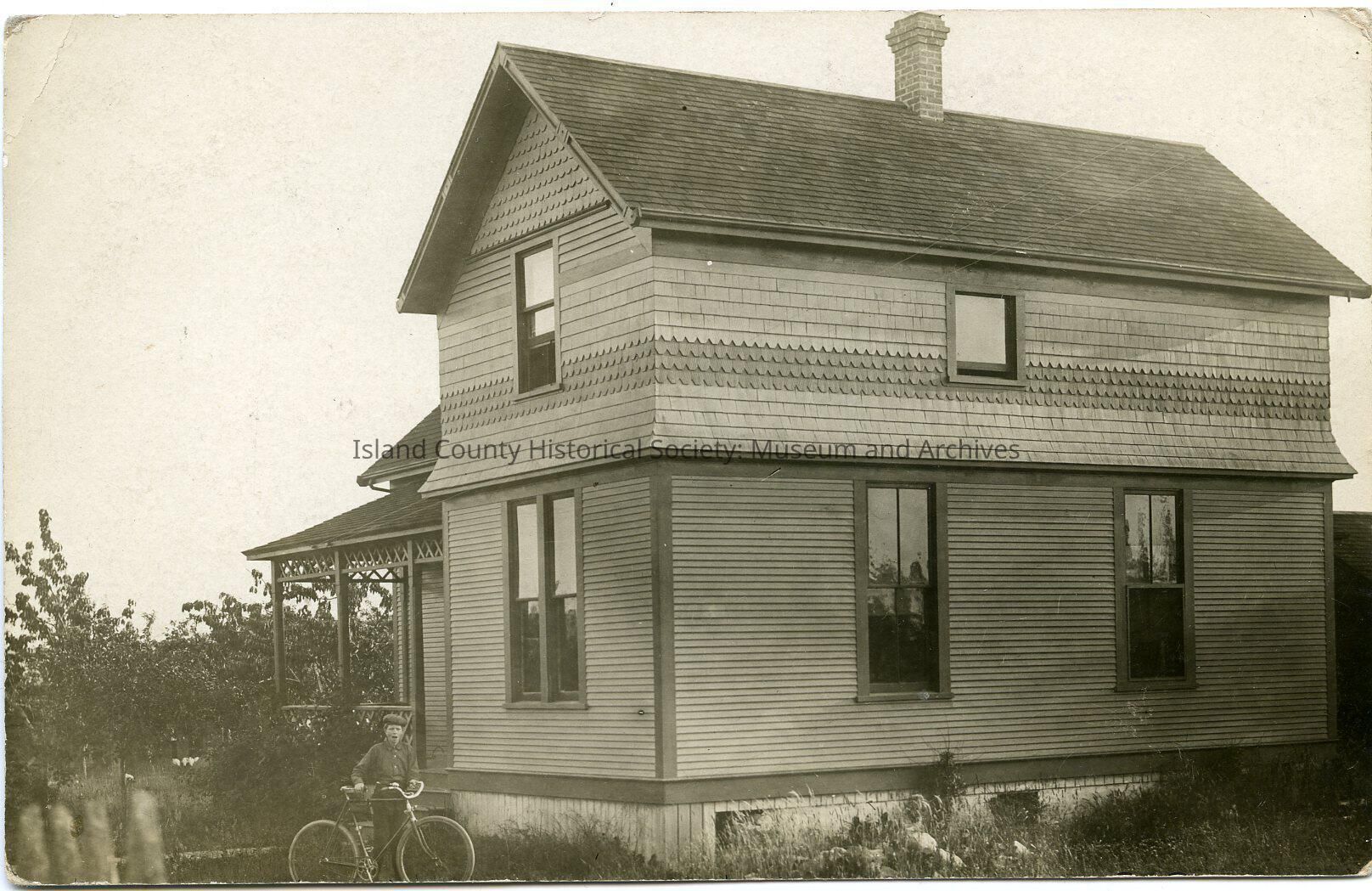 Postcard of a two-story house with a covered front porch, central chimney, curved roof eave, cedar shingles as siding on the second floor. A young man/older boy is standing with his bicycle in the front. Postcard sent to Miss Vera Hancock in Tempe, Arizona. Postmarked Jan 3 (or 30 or 31) 191 (last digit obscured by stamp). On the back: now Burton Engle home. From a sticky note: across street from lumbermans and (illegible) field (maybe).