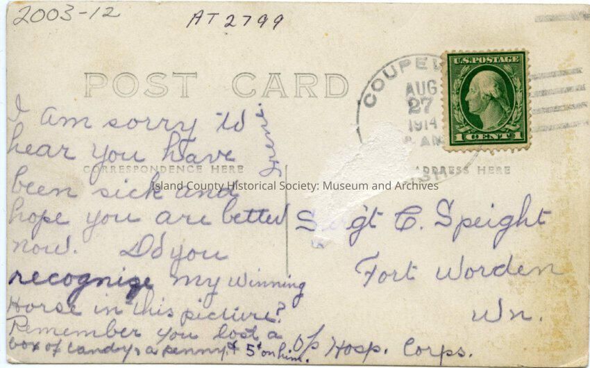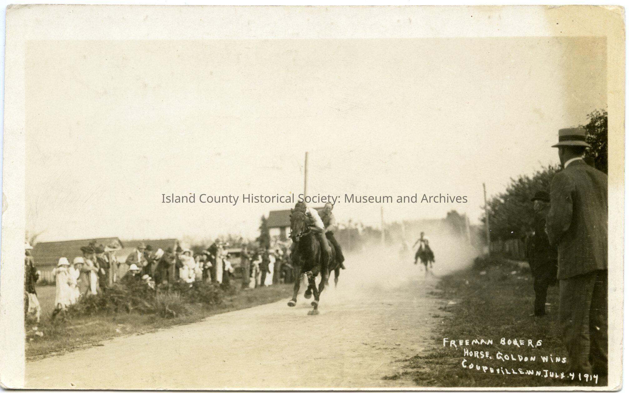 Photograph of men in a horse race. There are at least 4 horses. There is a crowd of men, women and children along the dirt road - lots of dust.On the lower right is written: Freeman Boyers' horse, Golden wins Coupeville, WN July 4 1914. It is a postcard. On the back is a note from the Op. Hosp (Hospital) Corps. to S(ar)g't C. Speight at Fort Worden, WN. It has a stamp and is potmarked 27 Aug 1914.Lexicon