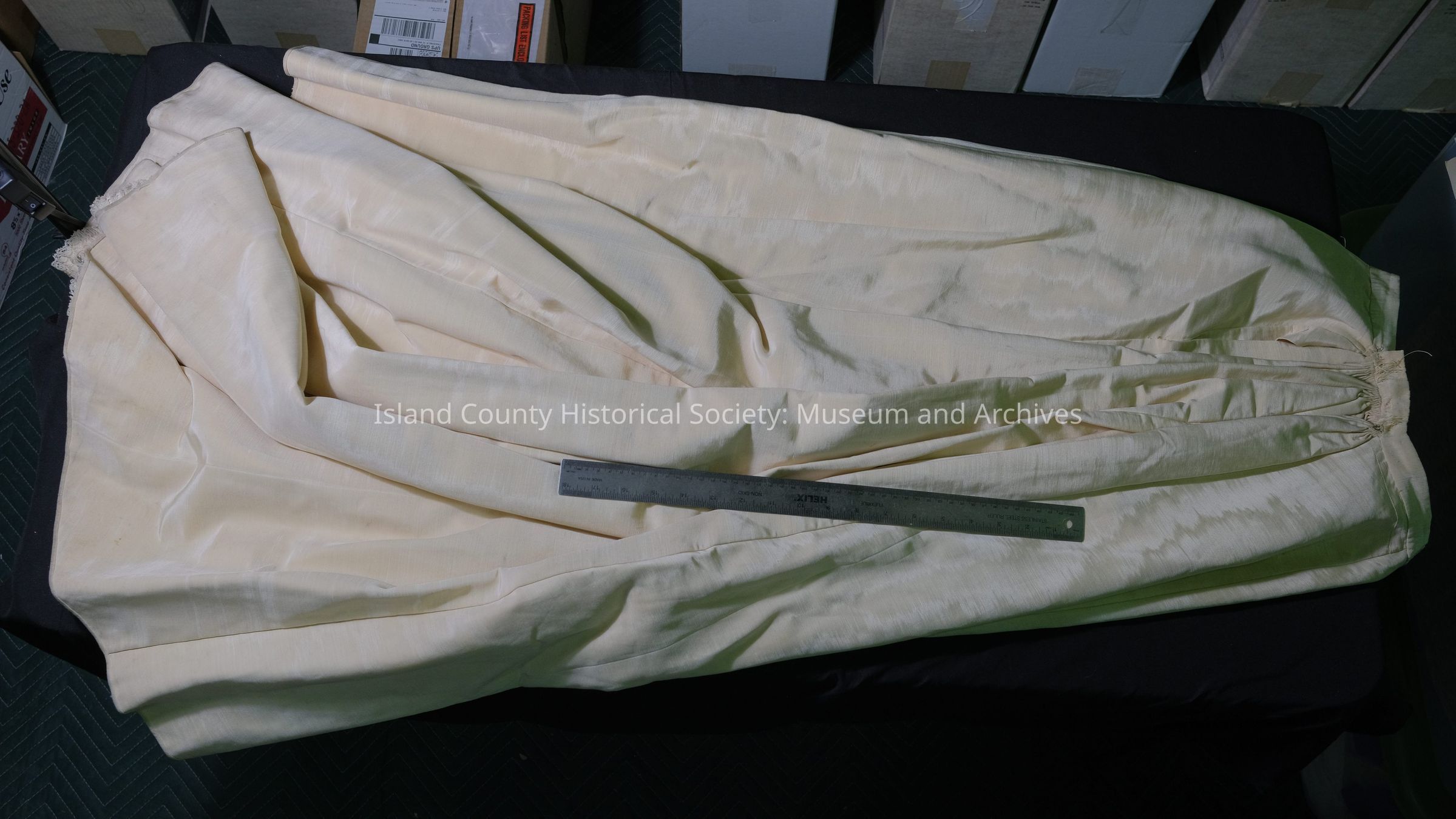 white silk dress - bead trim - 1890s - wedding dress, see card with the dress. Two pieces.