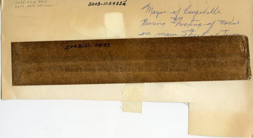 Photos of the negatives from 2014.004.091a-091e. On the back is written: "Mayor of Coupeville During Shooting of ovie on main street of town (Coupeville). Stapled to the back is a negative sleeve.