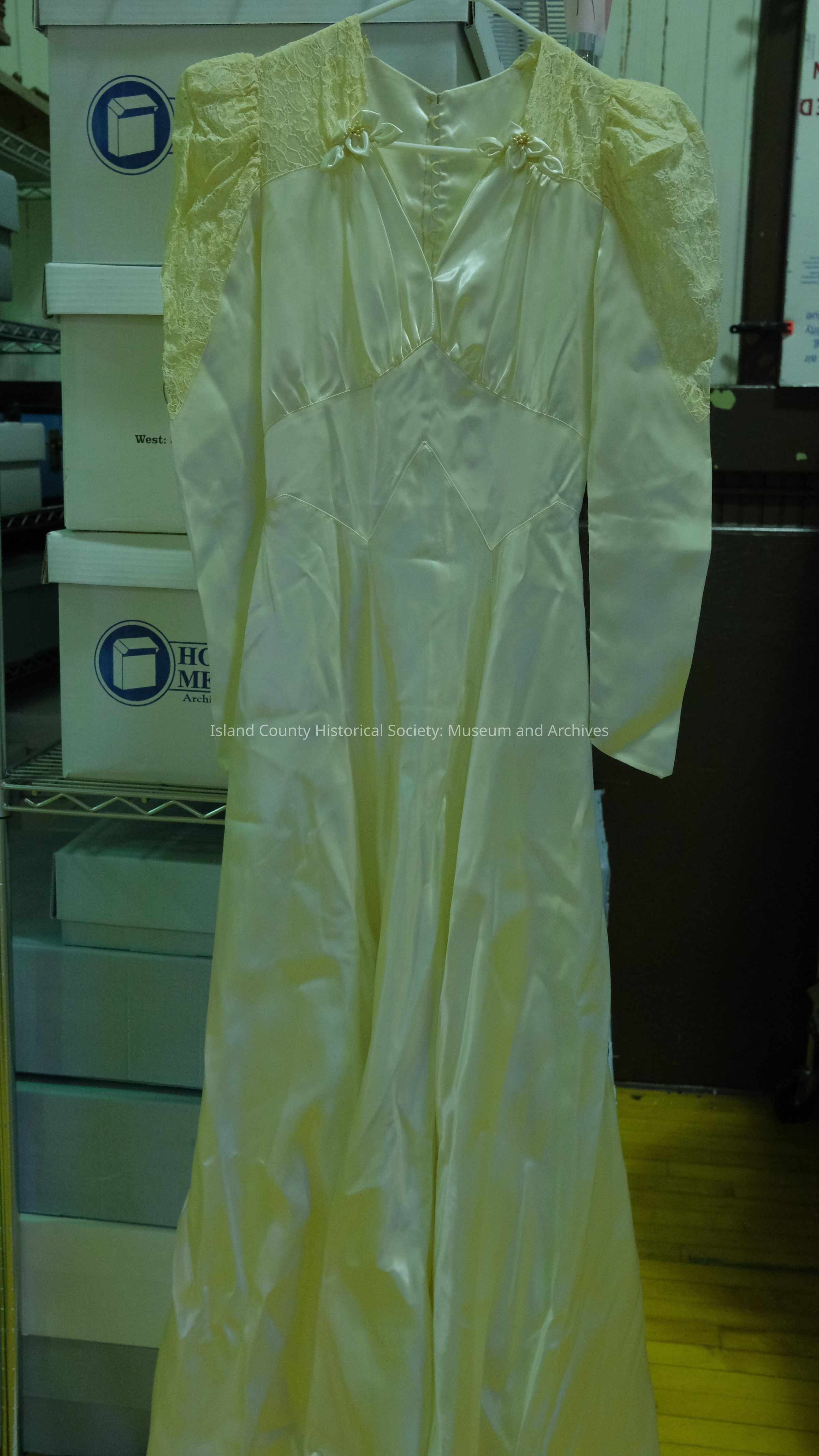 Wedding dress - 1943 - slipper satin and lace and veil (B). Married Topeka, Kansas - husband from Walla Walla. In Army. Moved to Whidbey in 1945.