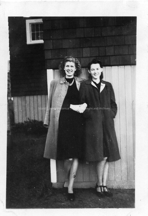 Photograph of Betty and Francis (possibly Betty Boyer). 1942. Standing in front of a side of a building, light panels, shingles upper section of building. Small window, wood shingles of building behind them. Betty - Wearing dark knee-length dress with light coat, necklace. Francis is wearing dark knee-length dress and dark coat with light lapels, T-strapped shoes. Written on back: "Betty and Francis, 1942". Given by Anna K. Eason, daughter of Sterling E. Anderson, who took the photos.Made/Created