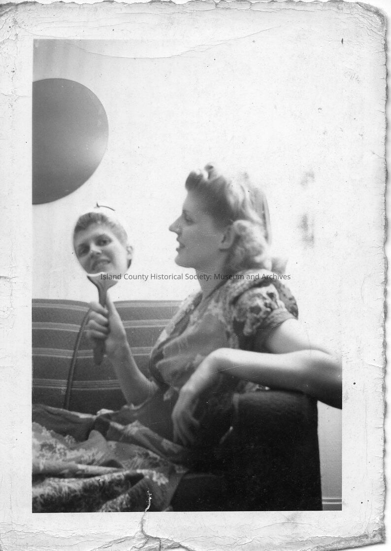 Photograph of probably Betty Boyer. 1943. Sitting on striped sofa, holding a mirror so her face is reflected to the camera. Short-sleeved dress with floral design. Written on back: "1943". Given by Anna K. Eason, daughter of Sterling E. Anderson, who took the photos.Made/Created