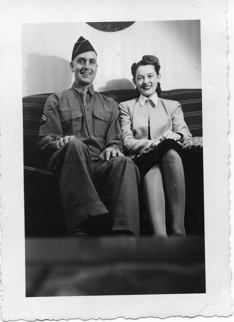 Photograph of Francis and Sterling sitting on striped sofa. He is in Army uniform with hat. She is wearing a jacket and skirt. Written on back: "Seattle, 1943, March 31, 1943" In blue pen on back is written: "Francis and Sterling". Given by Anna K. Eason, daughter of Sterling E. Anderson, who took the photos.Made/Created