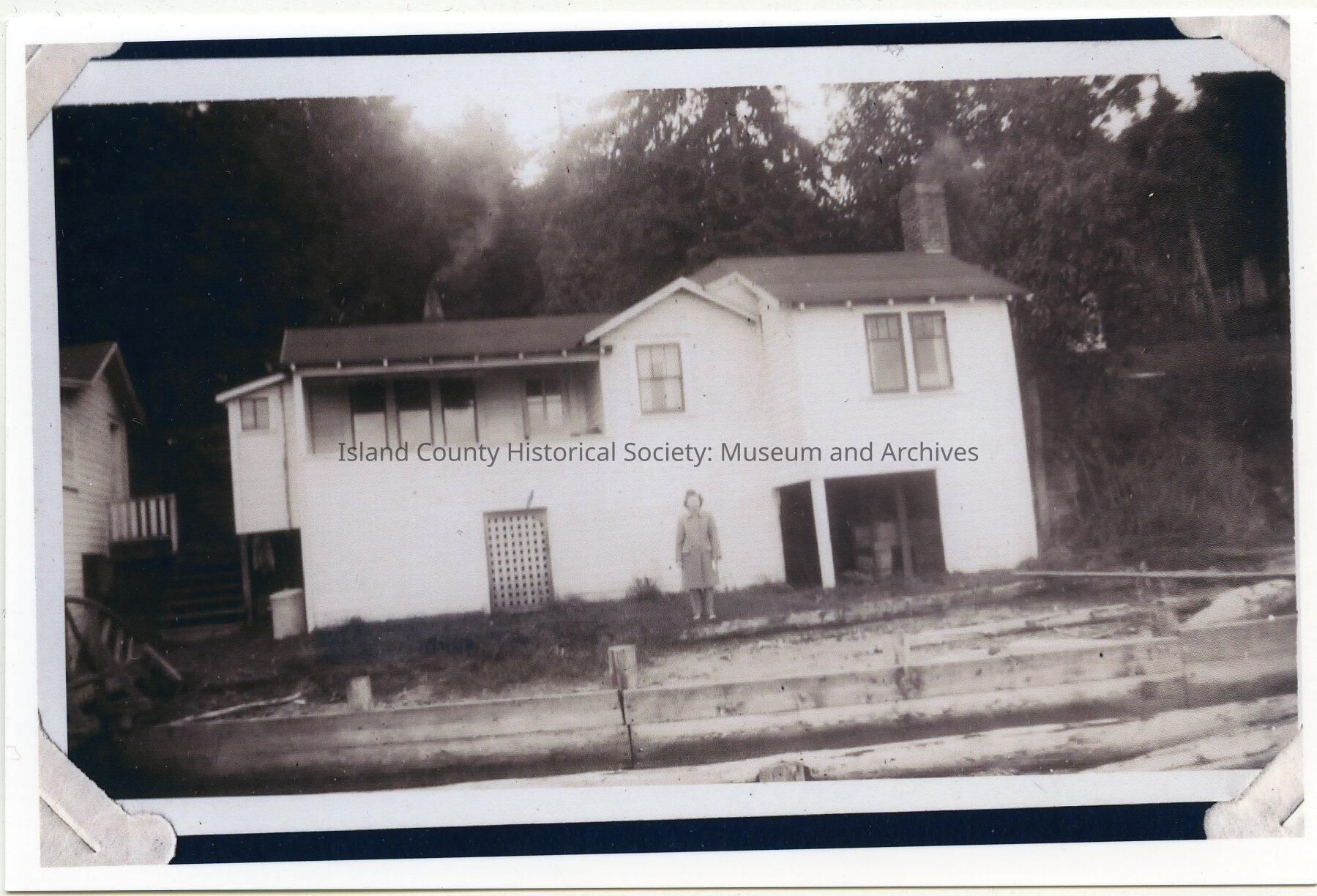 Photo of a woman in a coat standing in front of a two-story house with two chimneys (each smoking), a lattice door behind her. Covered balcony. Might be a storage area on the lower right side. Stairs lead up on the left. Might be on a beach - looks like a fence and logs in front.