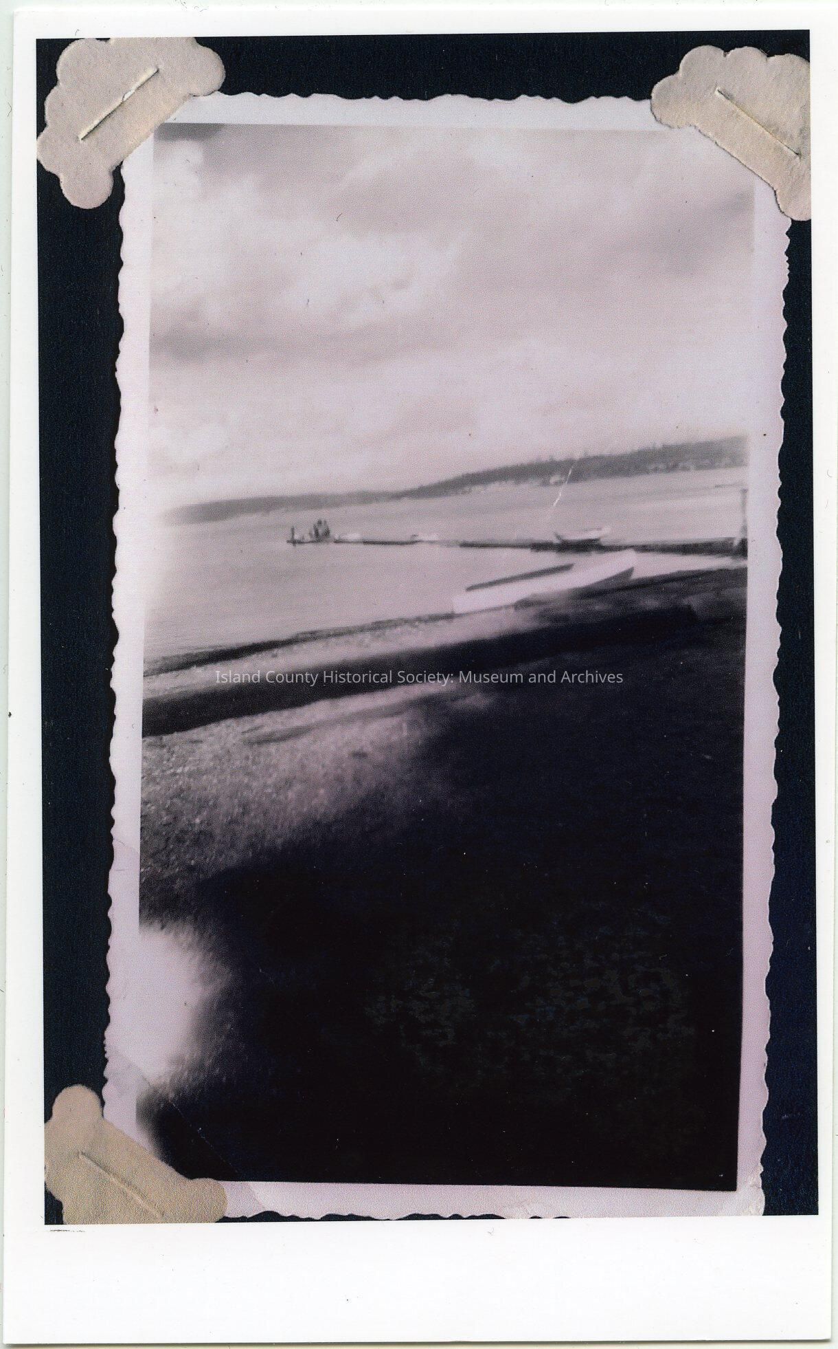 Photo of a pier with a few small/row boats. One boats is on the beach. Logs on the beach. From the folder: General Whidbey - Misc. Buildings - Unidentified photos