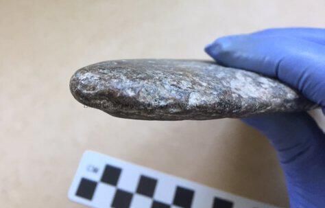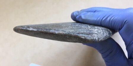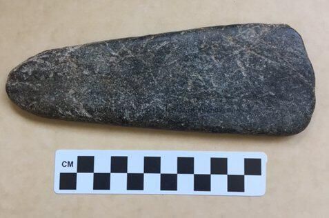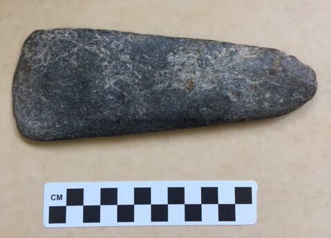 Native American stone adze tool. Stone is worked on all sides by smoothing and forming into a tapered shaped tool. One side has some inclusions which also appear smoothed & worked. One end has been worked to a wide angled point and working is evident by smoothing which is at a sharper angle one side. The other end is worked into a blunt point and has some smoothing and pecking damage.