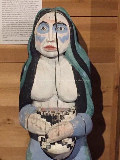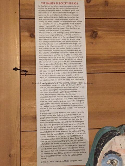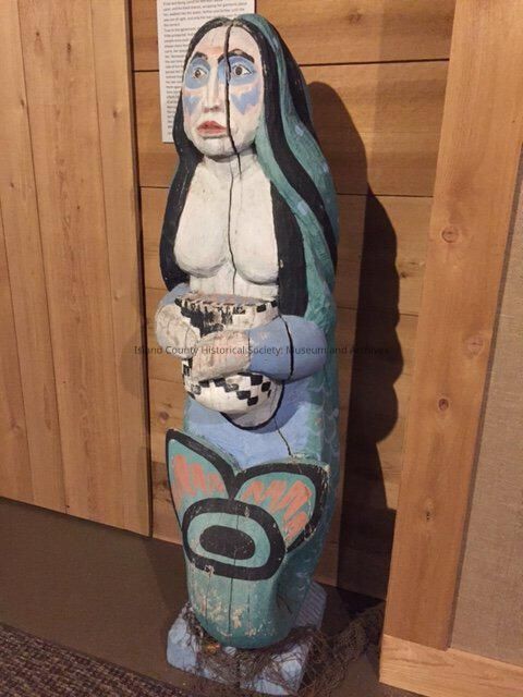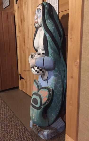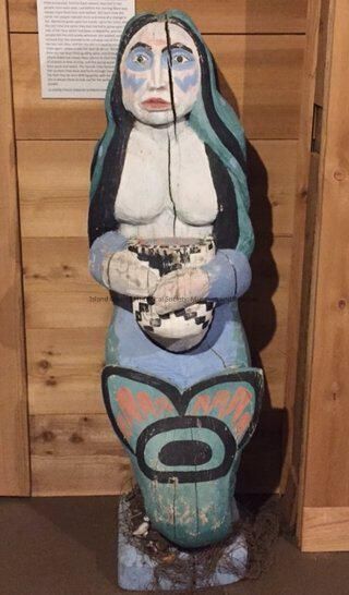 Maiden of Deception Pass carving. Wood carving of a mermaid painted in blue, green, black, red and white. Mermaid has long black and green striped hair with tail flipped up in front of her. Tail is green with blue scales and a black and red design on tip of tail. Mermaid upper body is white with blue arms and white hands holding a container in front with a black and white checkered design. Mermaid's face is white with black eyes and eye brows, blue face desgins around eyes and on cheeks, and red lips. There is a crack extending from top of head down into upper body of carving.Lexicon