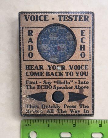 (This is a fantastic piece of prank history! The Voice Tester was produced by Johnson and Smith in the 1930's. This little piece of trickery packs a sinister punch. So innocent in it's presentation this little box, the size of a deck of cards and labled "voice tester" "Rado Echo" claims that if you speak into the woven speaker cloth and then quickly press the little wooden button you will hear your voice back.....however, there was originally a pin hidden in button, intended to stick the finger of the unsuspecting victim! )Lexicon