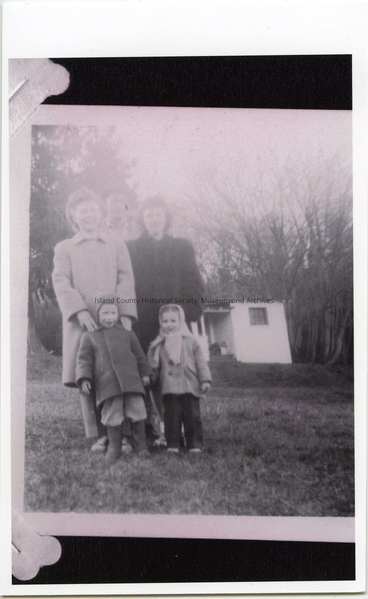 Photo of a child wearing a warm coat with a hood, trousers and boots. A girl wearing a warm coat, trousers and shows, with a scarf around her head is holding hands with the other child. Behind them are two women, waring coats, and a man behind them. They are in a field with a house behind them.