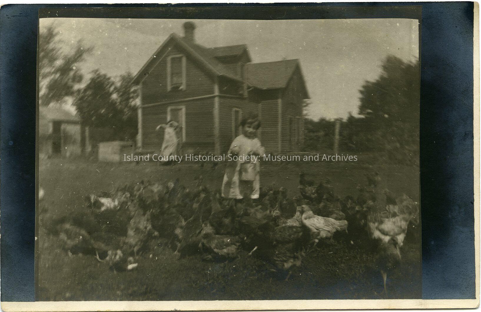 Postcard of a little girl feeding chickens. She is holding a pail with feed. Behind her is a woman watching her. Behind her is a two-story house, chimney, dormer. Outbuilding on the left. Fencing. On the back: This the Baby of the family feeding the chickens with Marcia leaning over the fence.