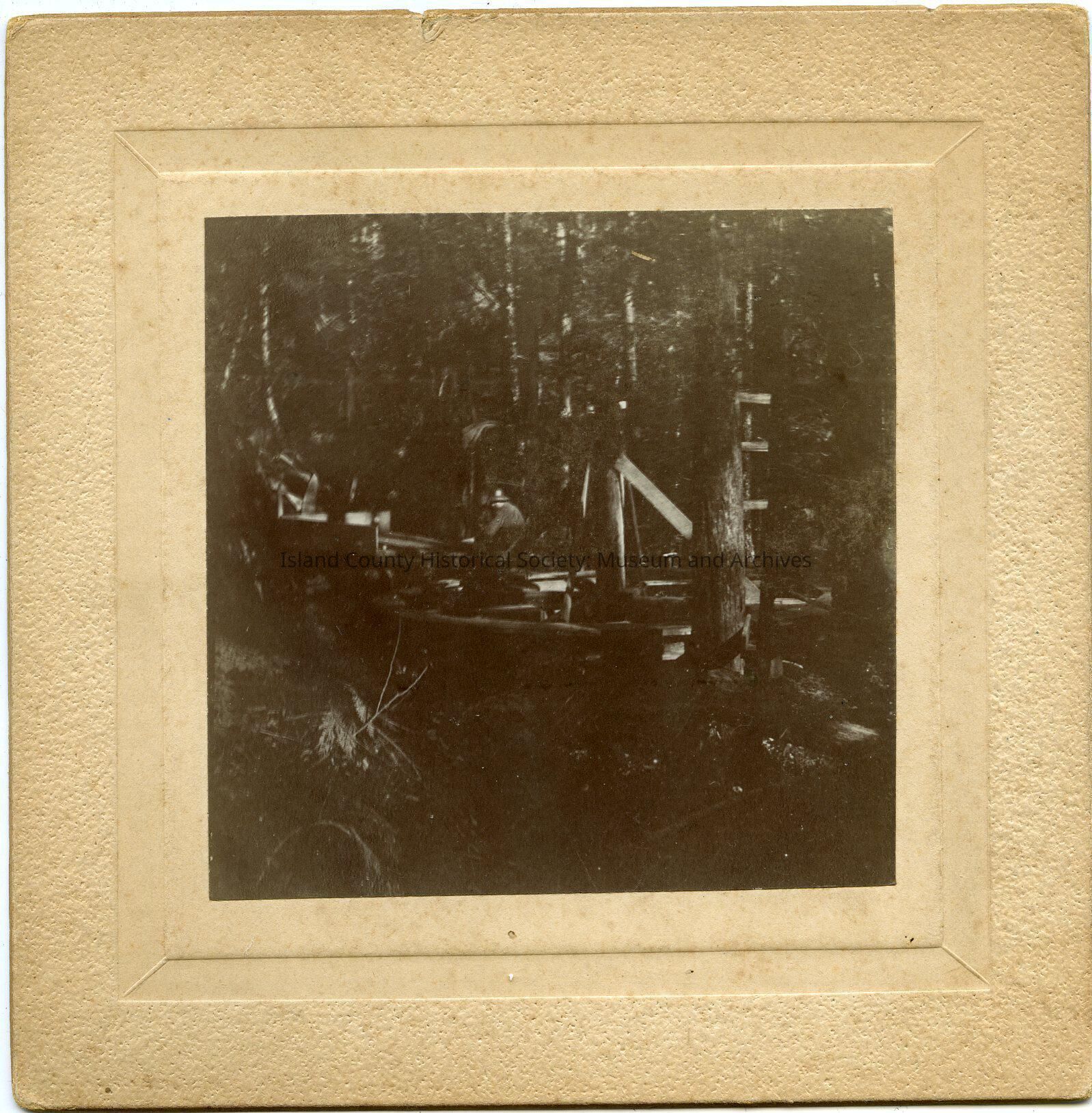Photo of a man on a tractor with working on a building or timbering. Lots of trees. Photo is so dark it's hard to tell what is happening. From the folder: General Whidbey - Misc. Buildings - Unidentified photos