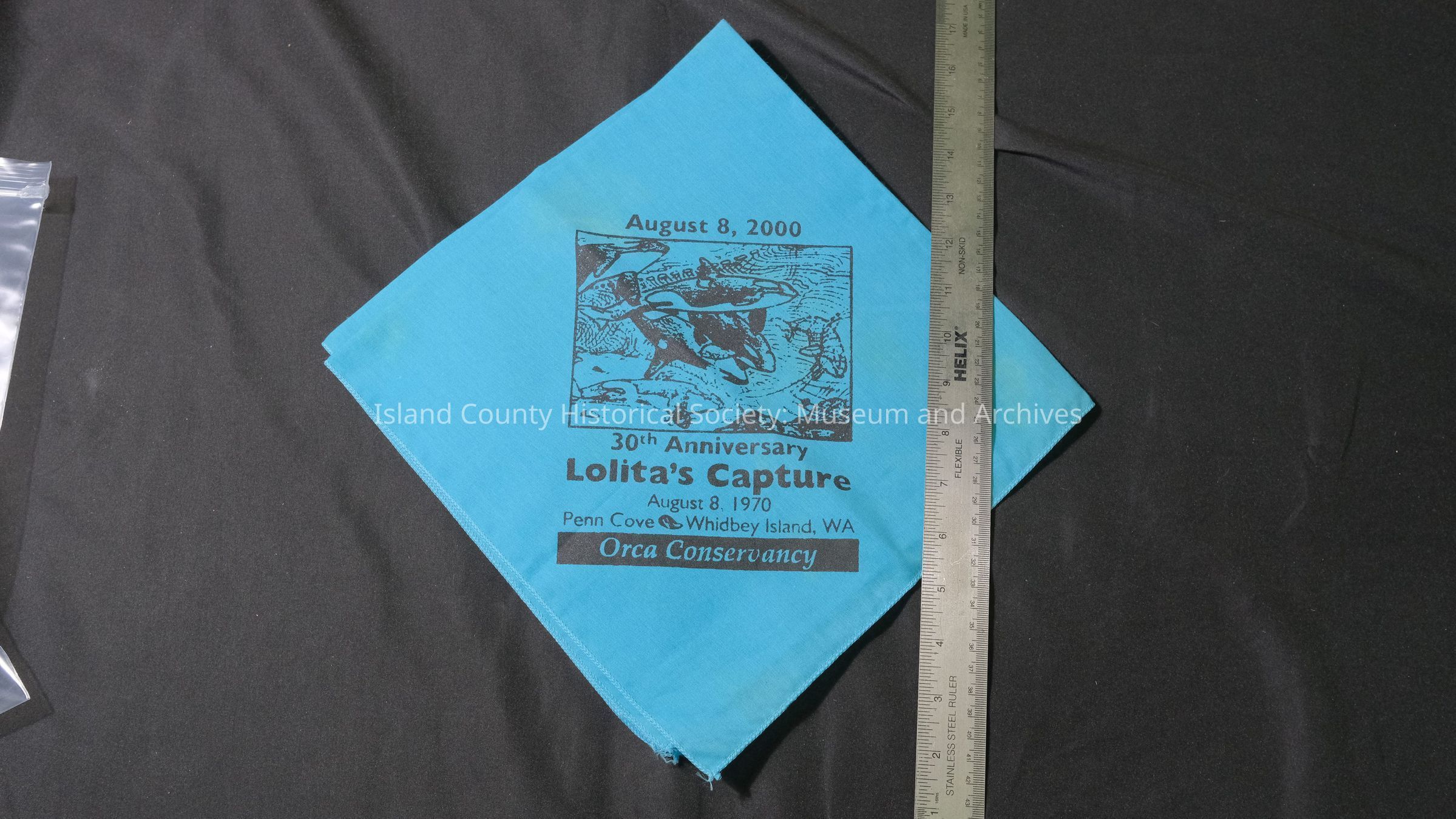 Aqua colored bandana commenorating the capture of the Orca Lolita. In the center of it is a picture of Orca whales in an ocean setting. Printed above the picture "August 8, 2000"