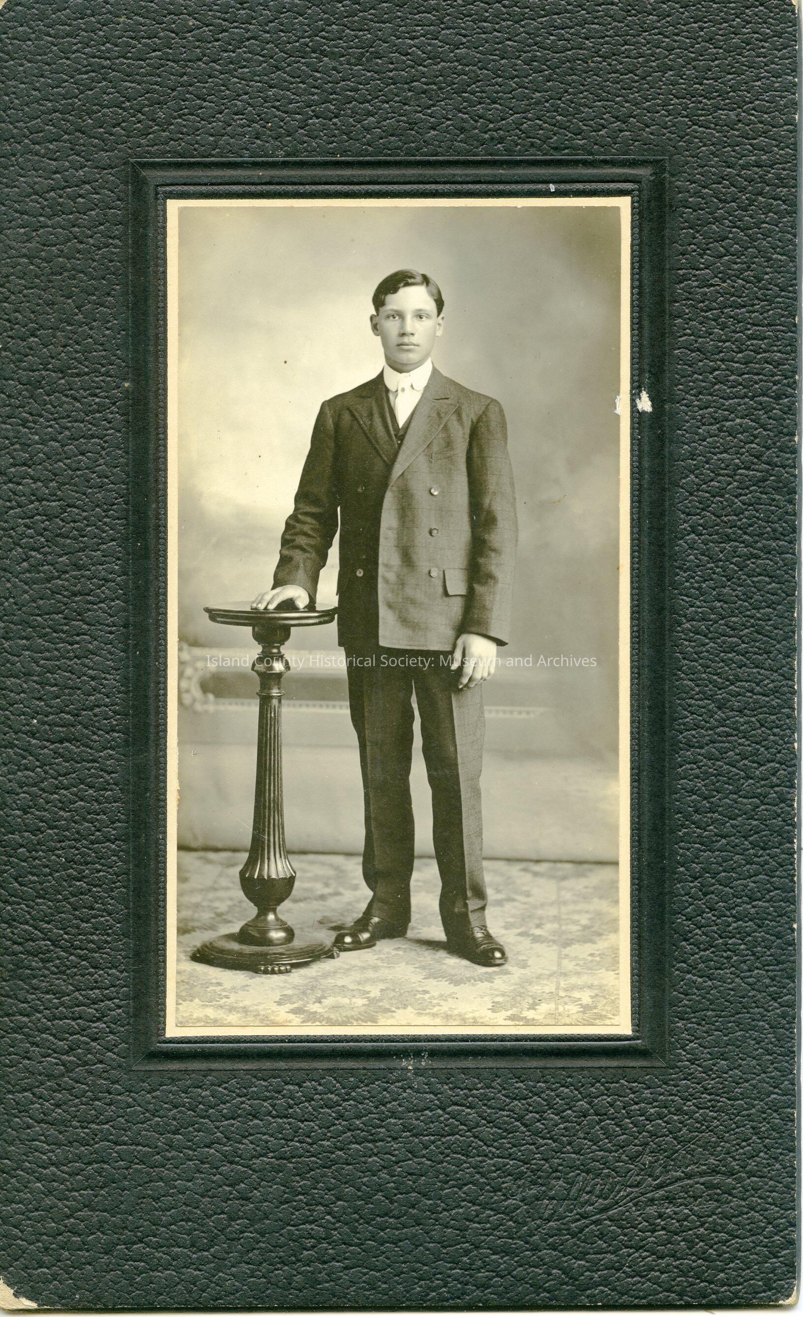 Photograph of young man, portrait, suit, standing with his hand on a hip-high round end table, floral carpet. Written on back: "Harvey Delos Park, 18 yrs" "Morris family",Made/Created