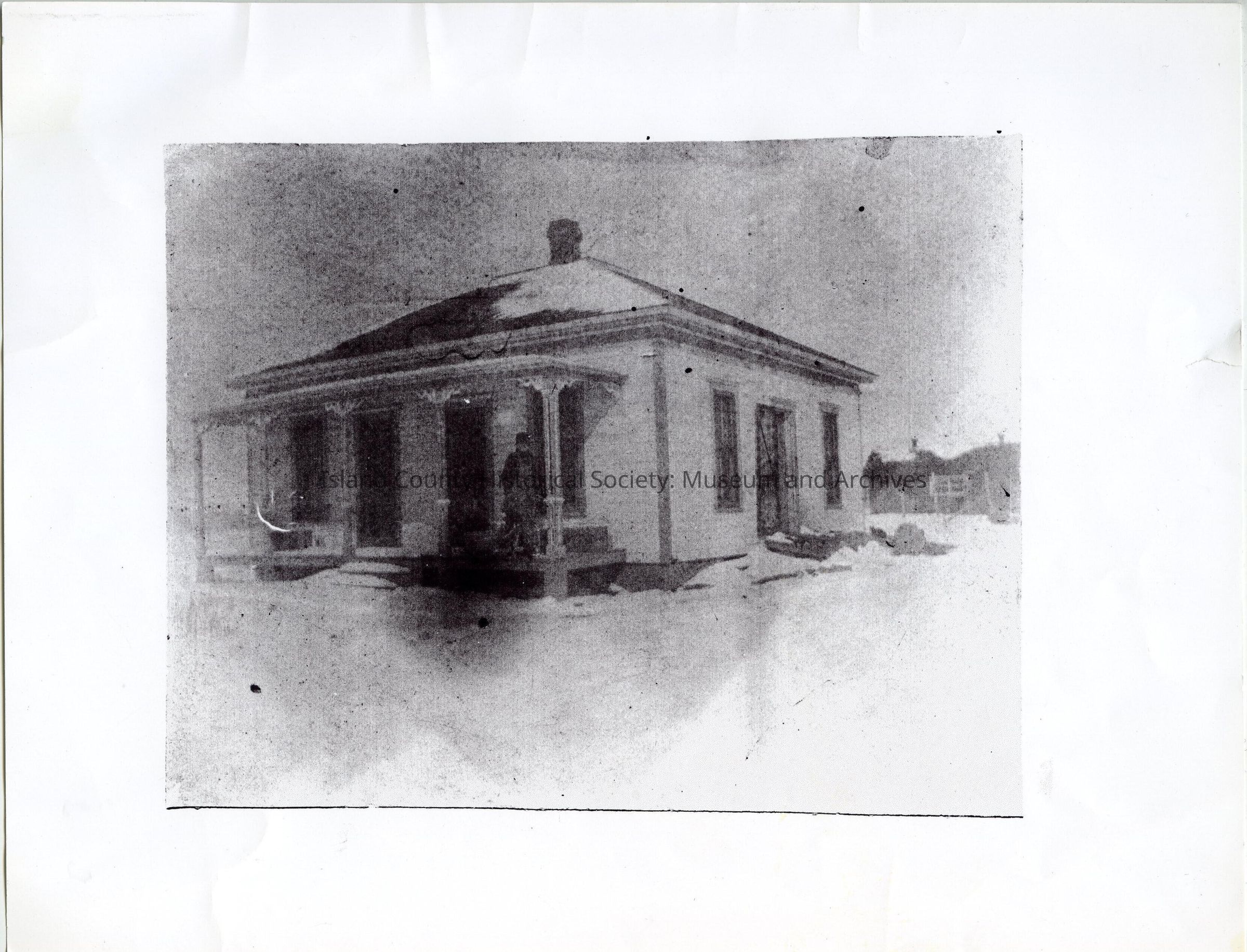 Photo of a square house, chimney at the top point of the roof, covered porch with curlicue designs on the tops of the columns. Man in overalls standing on the porch. Snow. From the folder: General Whidbey - Misc. Buildings - Unidentified photos