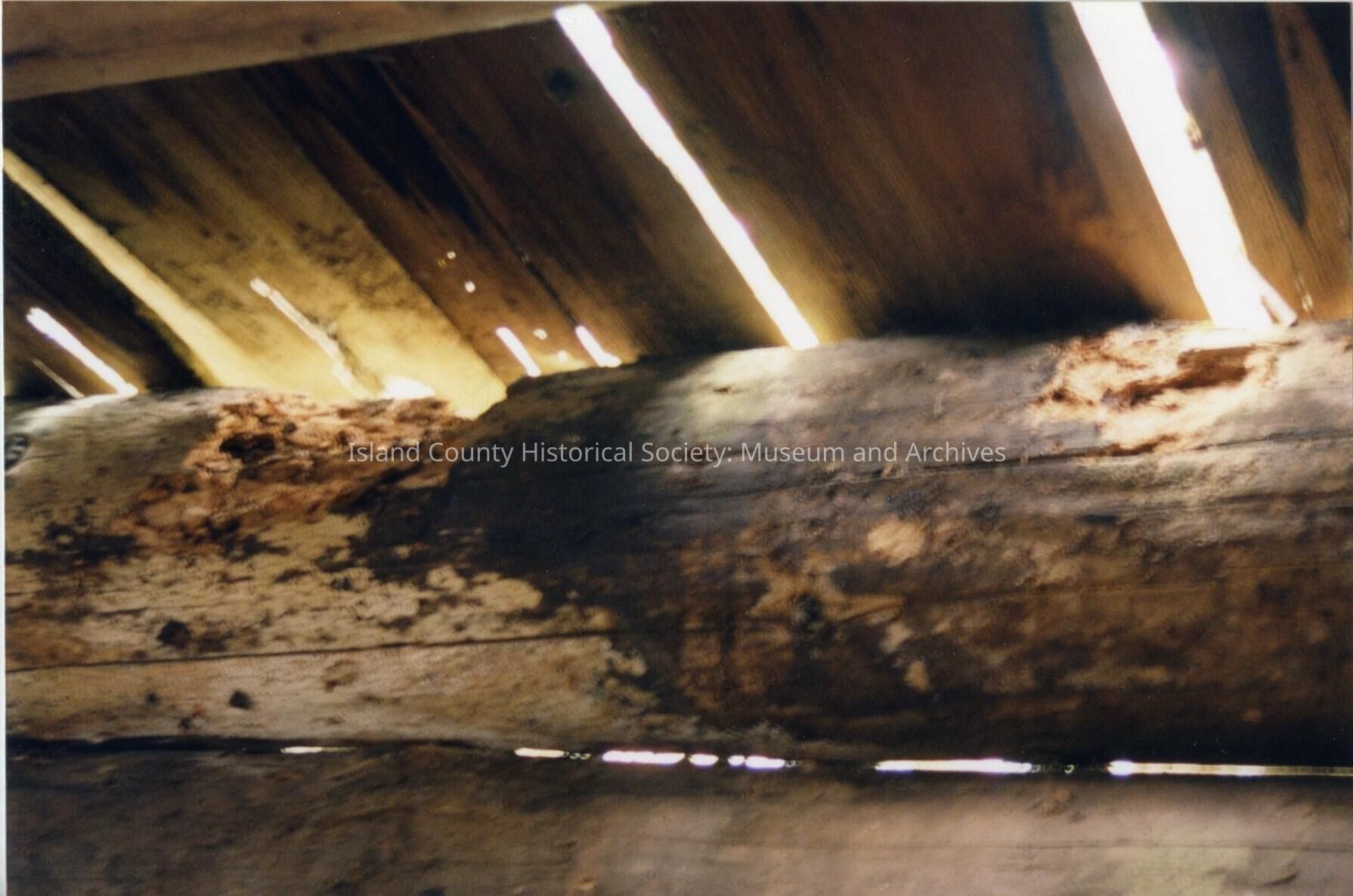Inside view of Blockhouse on the Ebey house property. The picture is slightly out of focused and it looking at the ceiling of the blockhouse where you can see some damage to one of the logs.