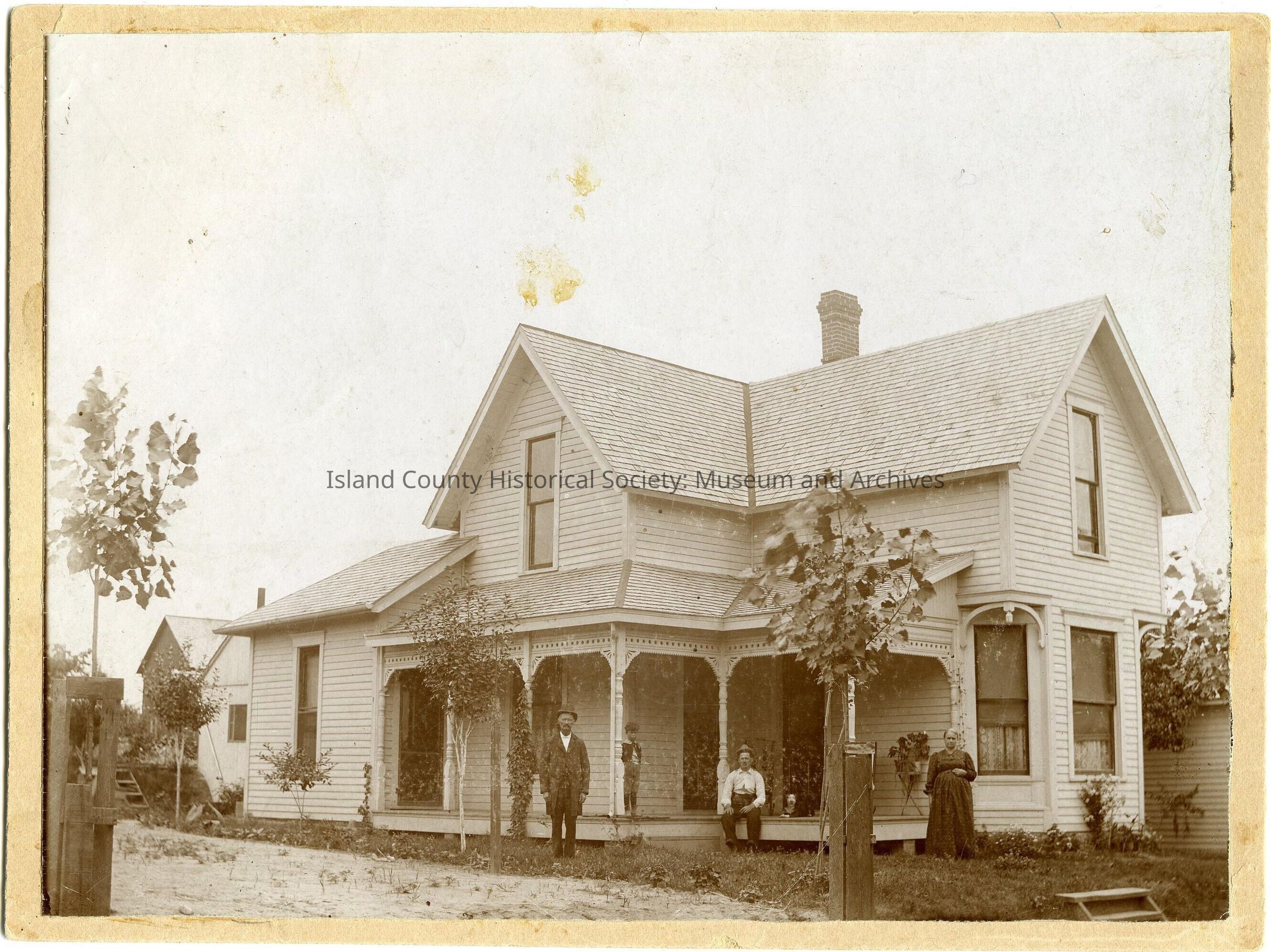 Photo of a two-story house with covered porch around most of the side with three doors off it. Front section on the right - top has eaves over windows in a fake bay window style. Steps in the foreground. Dirt path or drive. Bushes and small trees. Two men, one standing, the other sitting on the porch. A woman standing beside the fake bay window. A boy in knickers, flat cap on the porch, a dog lying on the porch next to the man. On the back: where?
