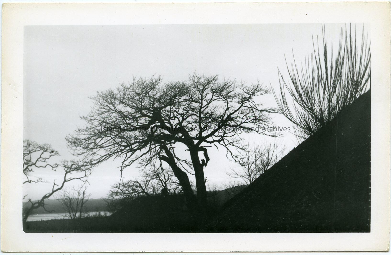 Postcard of a few trees on a hill overlooking water and another hill beyond. Trees oare in silhouette.