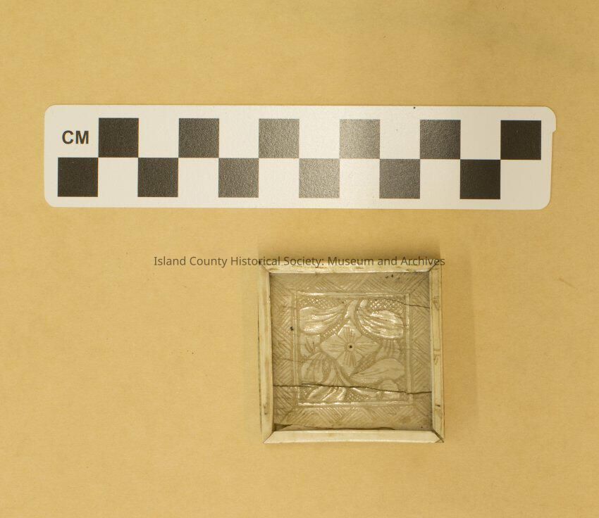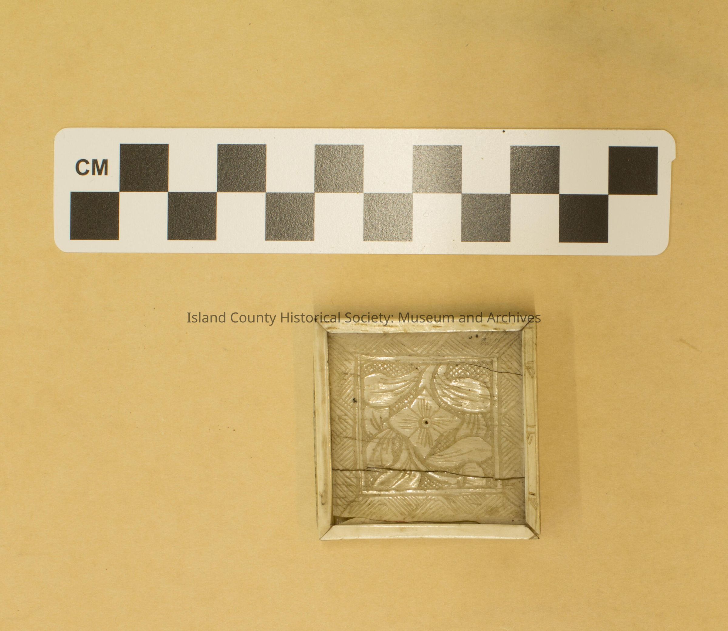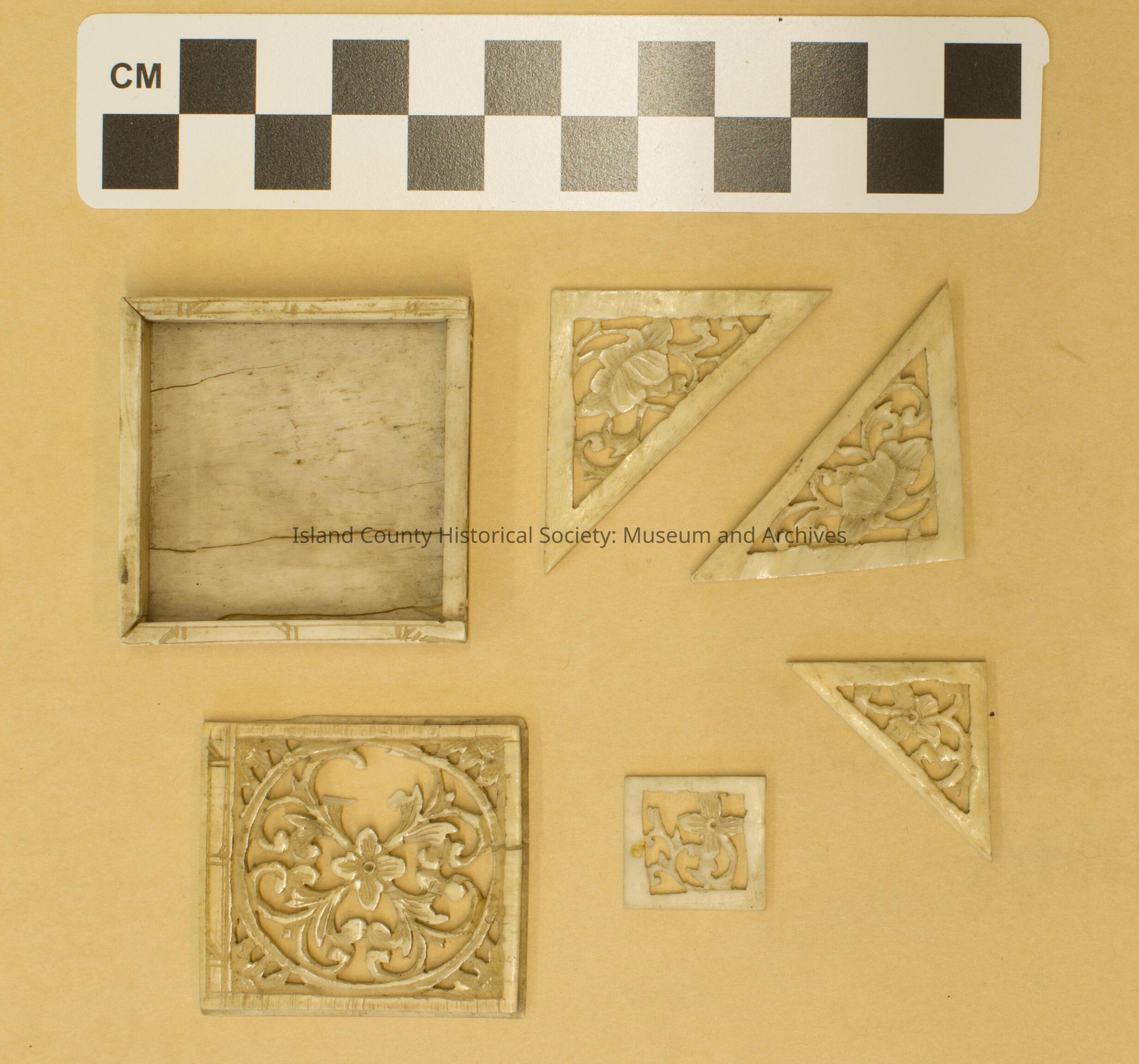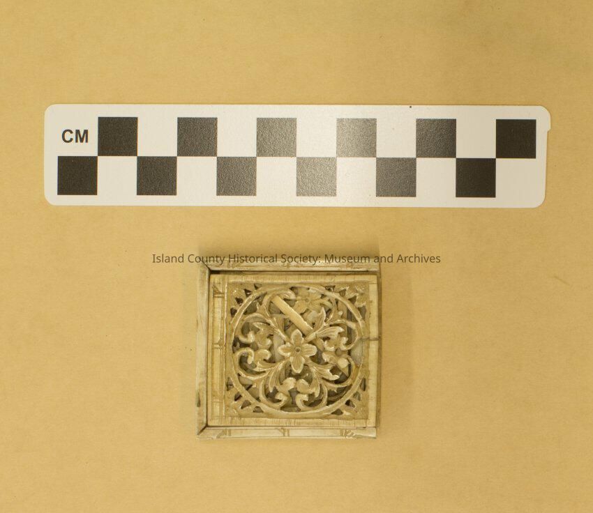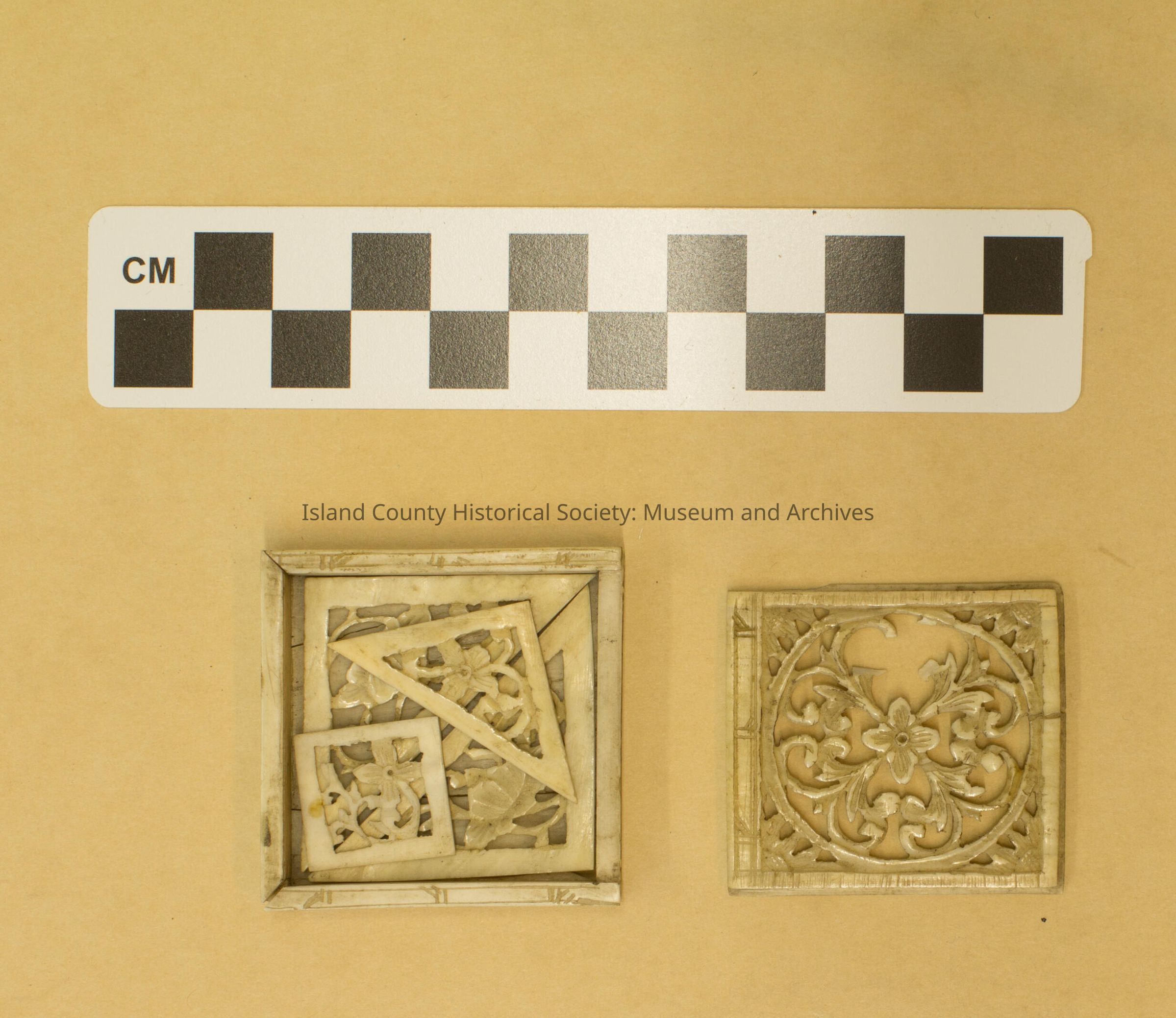A small square ivory puzzle box containing 4 puzzle pieces under the lid. The lid is very ornate with flowers and leaves carved through it. The sides of the box have flowers carved into them. The bottom has a flower in the center surrounded by petals, There is a crack in the bottom and a hole on top. The box is 1.75 in x 1.75 in square by .25 inch thick..Lexicon