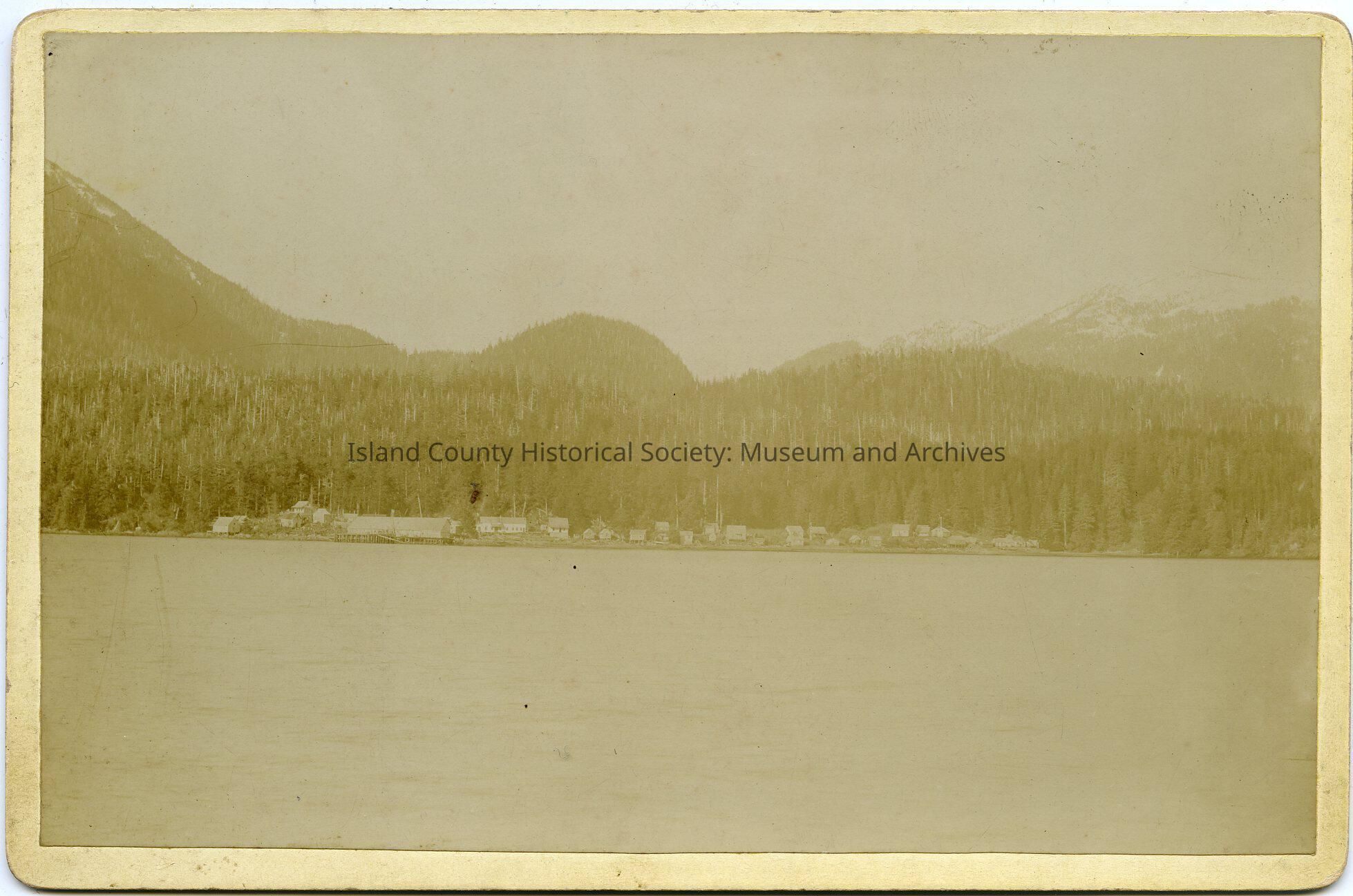 Photo looking across an expanse of water to hillls and snow-covered mountains, cluster of houses and other buildings along the shore. Trees. From the folder: General Whidbey - Photos - Misc. Unidentified