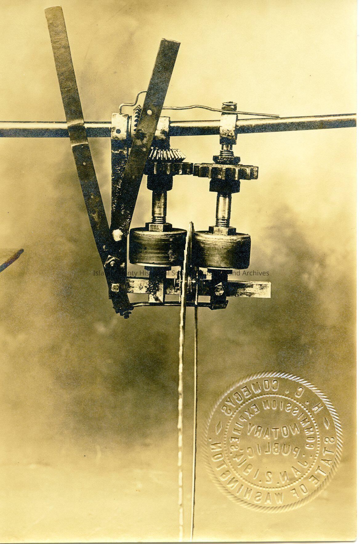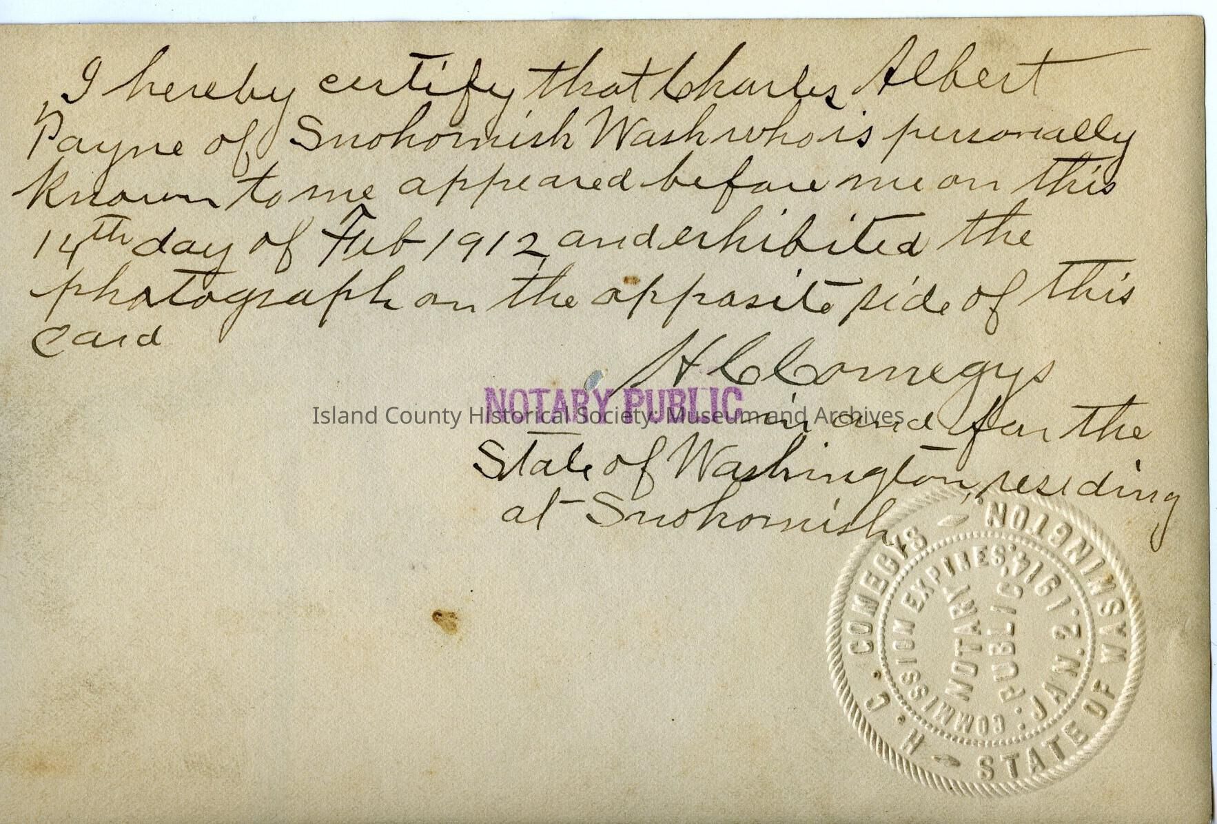 Photograph of metal gears, wires, blades. Taped to the protective sleeve is C. A. Payne. Notary seal of H. G. Comegys State of Washington Notary Public Commission Expires Jan. 2 1914, Written on back: in pen:"I hereby certify that Charles Albert Payne of Snohomish Wash who is personally known to me appeard before me on this 14th day of Feb 1912 and exhibited the photograph on the opposite side of this card. H. G. Comegys Notary Public in and for the State of Washington residing at Snohomish"Made/Created
