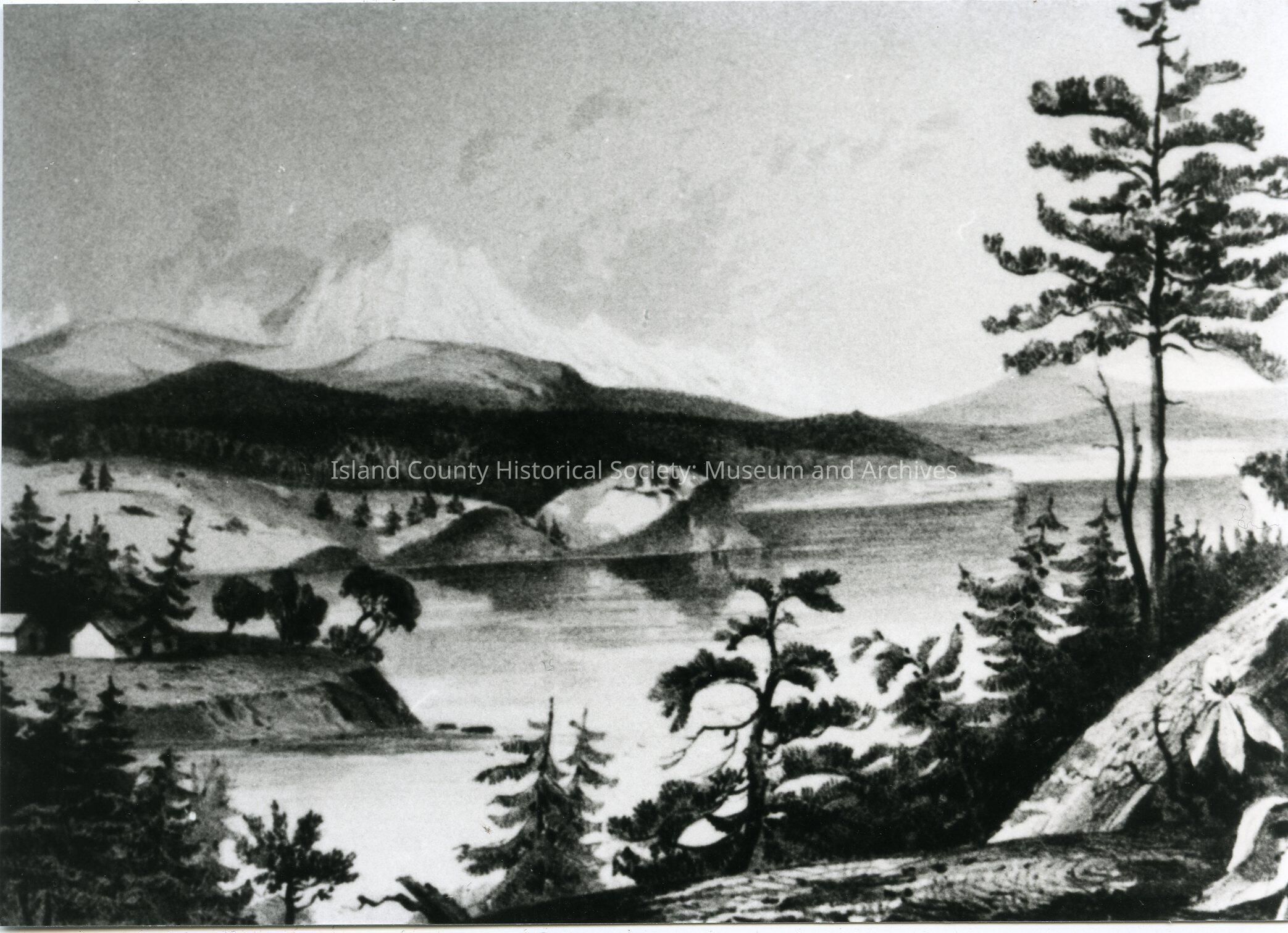 Photo of a print: Mt Baker & Cascade Range from Whitbys Island. Print done by Stanley Del. Closeup of the print. On the back: From the folder: General Whidbey - Photos - Misc. Unidentified