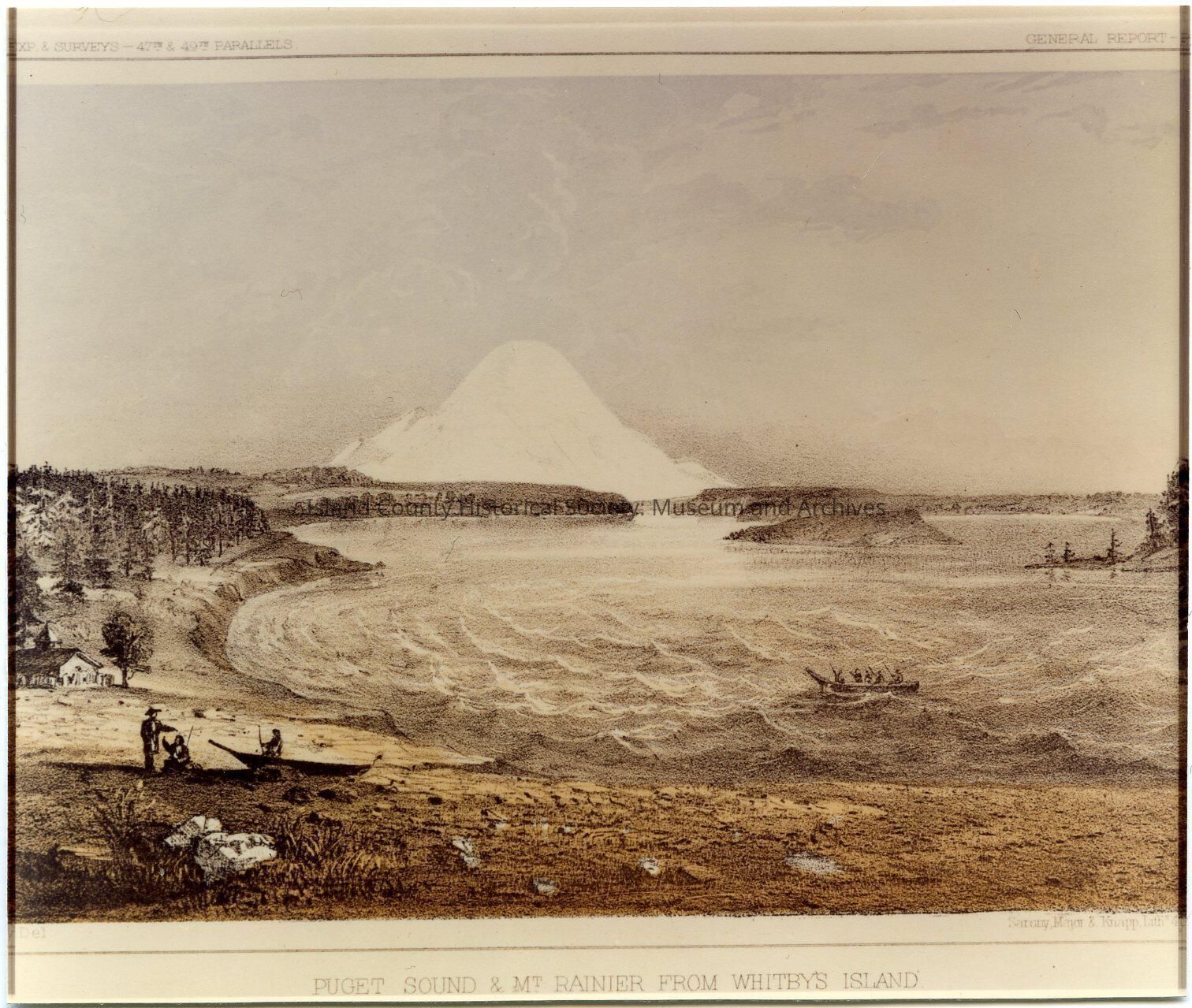 Photo of a print: Puget Sound & Mt. Rainier from Whitby's Island On the top: General Report - (cut off). On the bottom left: ..y Del From the folder: General Whidbey - Photos - Misc. Unidentified