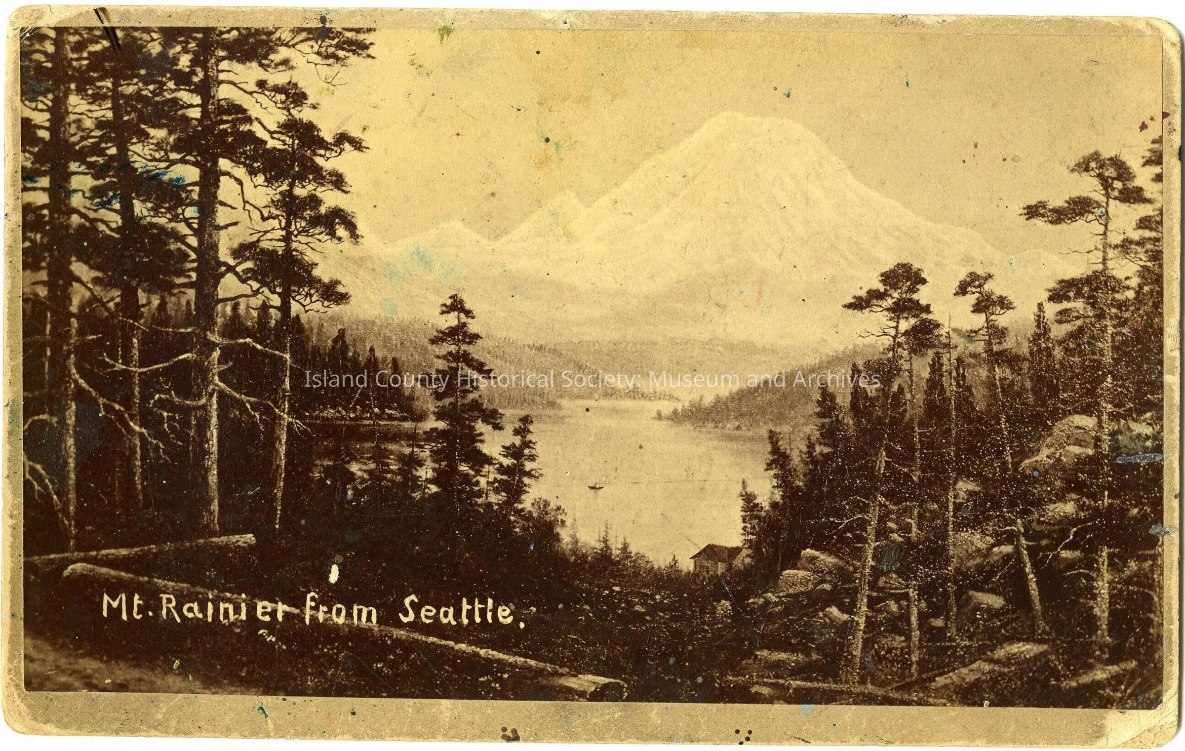 Photo of Mt. Rainier in the center; water in the center, trees on hills around the foreground; cabin in lower front, person on a row boat on the water. Caption: Mt. Rainier from Seattle.