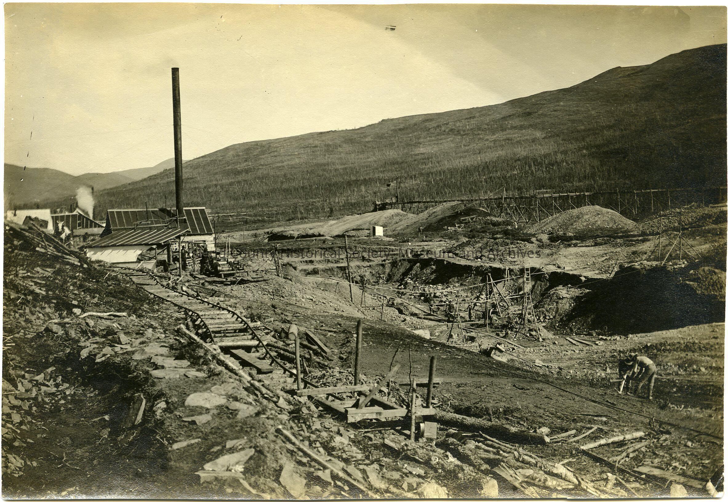 Photo of probably a camp of some sort. Men walking along a narrow set of planks in the river bed are holding something in one hand; others are handling wheelbarrows. Varioius poles and ropes set up, a metal covered building on the right with very tall chimney; at least two men in the building. A set of tents and a few buildings in the central background. Trees on the hills. Lots of mud and dirt. Tram tracks.
