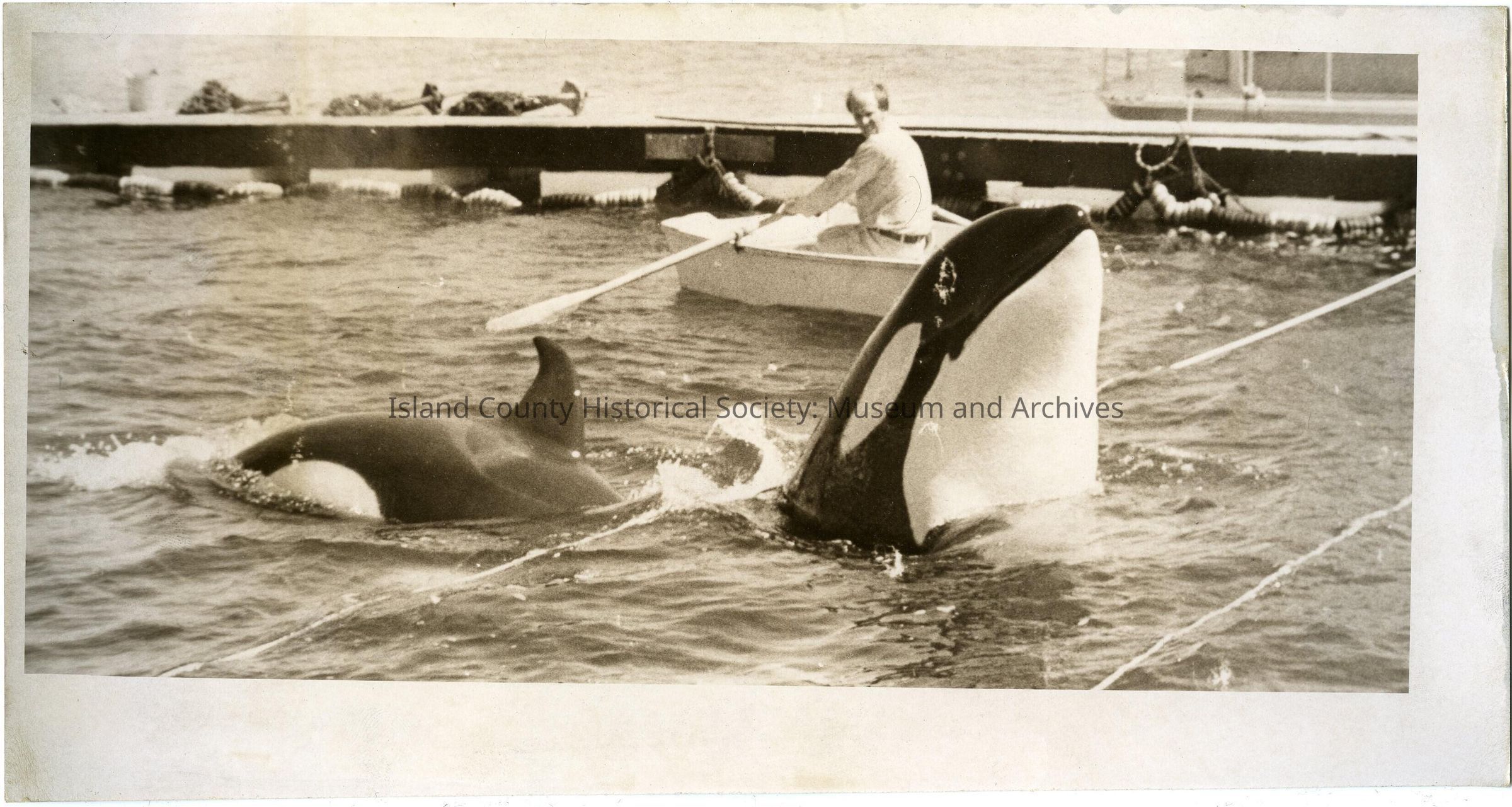Photo of two orcas, one spyhopping, the other with just the back and dorsal fin showing. A man in a rowboat behind them. Beyond him is a long short pier. On the back: 1970 Killer Whales off San de Fuca.