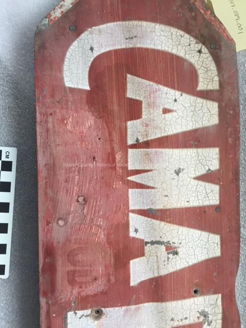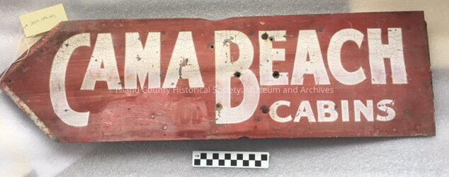 "Cama Beach Cabins" sign. Painted white lettering on painted red background metal sign attached to wooden backing. Rectangular shaped which narrows to a point on the left end. Bottom left wording "Stanwood" has been painted over. Sign was posted along Highway 99 (between Seattel & Stanwood). Sign was taken down at some point and came into the hands of the Cama Beach State Park.