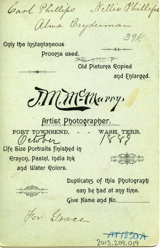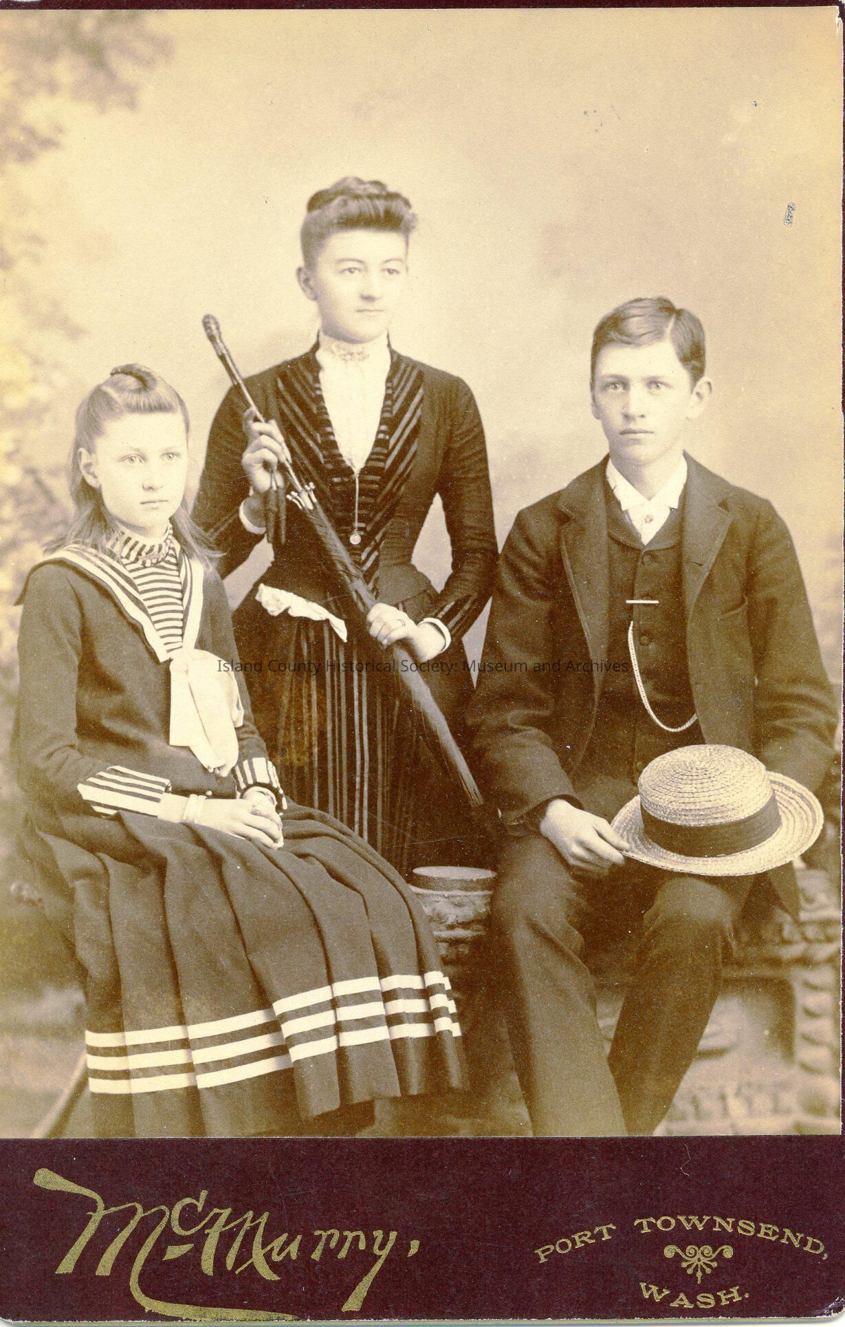 Photograph or portrait of three young adults. Carl Phillips, Nellie (Nel) Phillips, and Alma Gleason (or Alma Crydunnan). Young male is picture sitting on the right side of the picture. He is wearing a dark suit with a white shirt. He has a straw hat resting on his knee. Female in the center of picture is standing and is wearing a dark full length dress with striped trim over a white shirt. Her hair is pulled back and she is holding an non extended umbrella. The female on the left of the picture is sitting and is wearing a dark full length dress with striped trim with a striped shirt. Her hands are resting in her lap and her hair is pulled back and down in the back. Hair is slightly over shoulder length. Back of the picture says "Carl Phillips. Nellie Phillips. Alma Crydunnan. October 1889. For Grace."