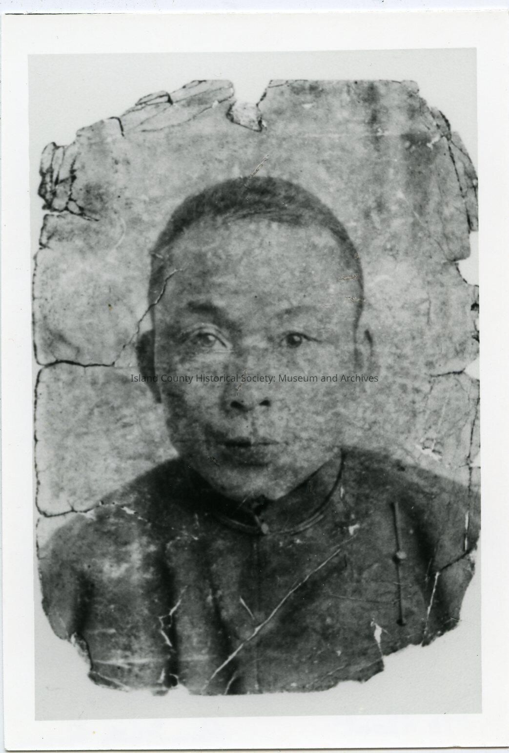 Photo of a young Chinese man. He has close-shaven hair and is wearing a jacket or shirt with a partial collar. On the back: Ah Soot, From Dorothy Sherman From the folder: RG 24, Island County Asian History