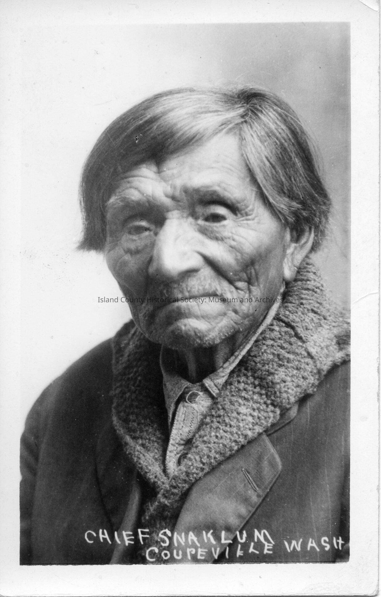 Portrait on a postcard of Chief Snaklum Coupeville, Wash. Snaklum is wearing a suit jacket with a sweater under, the sweater has a large knitted neckline. His hair is parted over to one side. On the back is written: "Charlie Snakelum Born 1862 Died 1932 age 70"