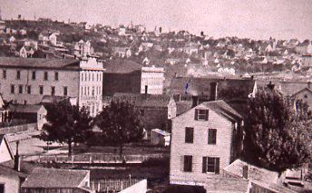 Photograph of the view from King Street in Seattle, prior to the Great Fire of 1889. Many of the pictured buildings were destroyed in the fire. Pictured are: R. Carkeek's home, Arlington Hotel, Squire's Opera House and New Brunswick Hotel. Center foreground is the Felker Home.Photograph Details