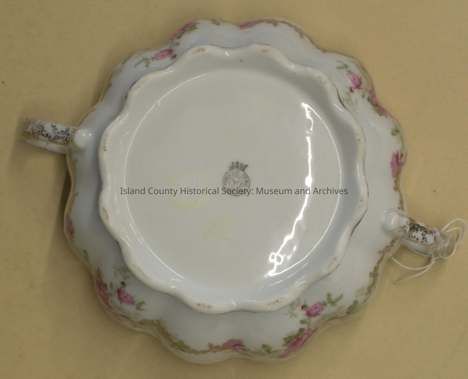 A Wheelock China Austria candy bowl or dish with a lid. Red roses in a floral ring around the dish and top. Two handles on the bowl and one on the lid. Gold trim on the handles, around the rims and center floral pattern. Green trim on the rims. Scalloped rims top and bottom of the dish. Wavy exterior to the bowl. From two notes with the bowl and lid: "This cracker bowl given to Mel and Dorothy Neil as a wedding present in 1930 by Sadie Morse Davis, Oak Harbor pioneer who received it as a wedding gift when she married Robt Davis abt 1880." "Sadie Morse Davis (Mrs. Robert Davis) was the daughter of Capt George MOrse, one of OH's first sea captains. One of her wedding gifts in the early 1860's was this cracker bowl. When Mel Neil and Dorothy Burrier were married in 1930 Sadie gave the cracker bowl to them as a wedding gift! Sadie sailed thru the Pass with her father and observed that "one day there will be a bridge across the pass between the two islands.""