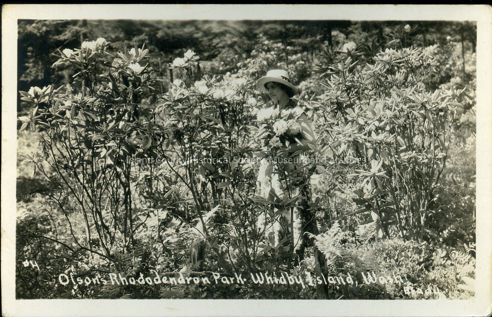 Postcard from Olson's Rhododendron Park, "Whidby" Island, Washington. The reverse contains a typewritten message to Jennie M. Tattersall. Postmarked June 2nd, 1931.Collection