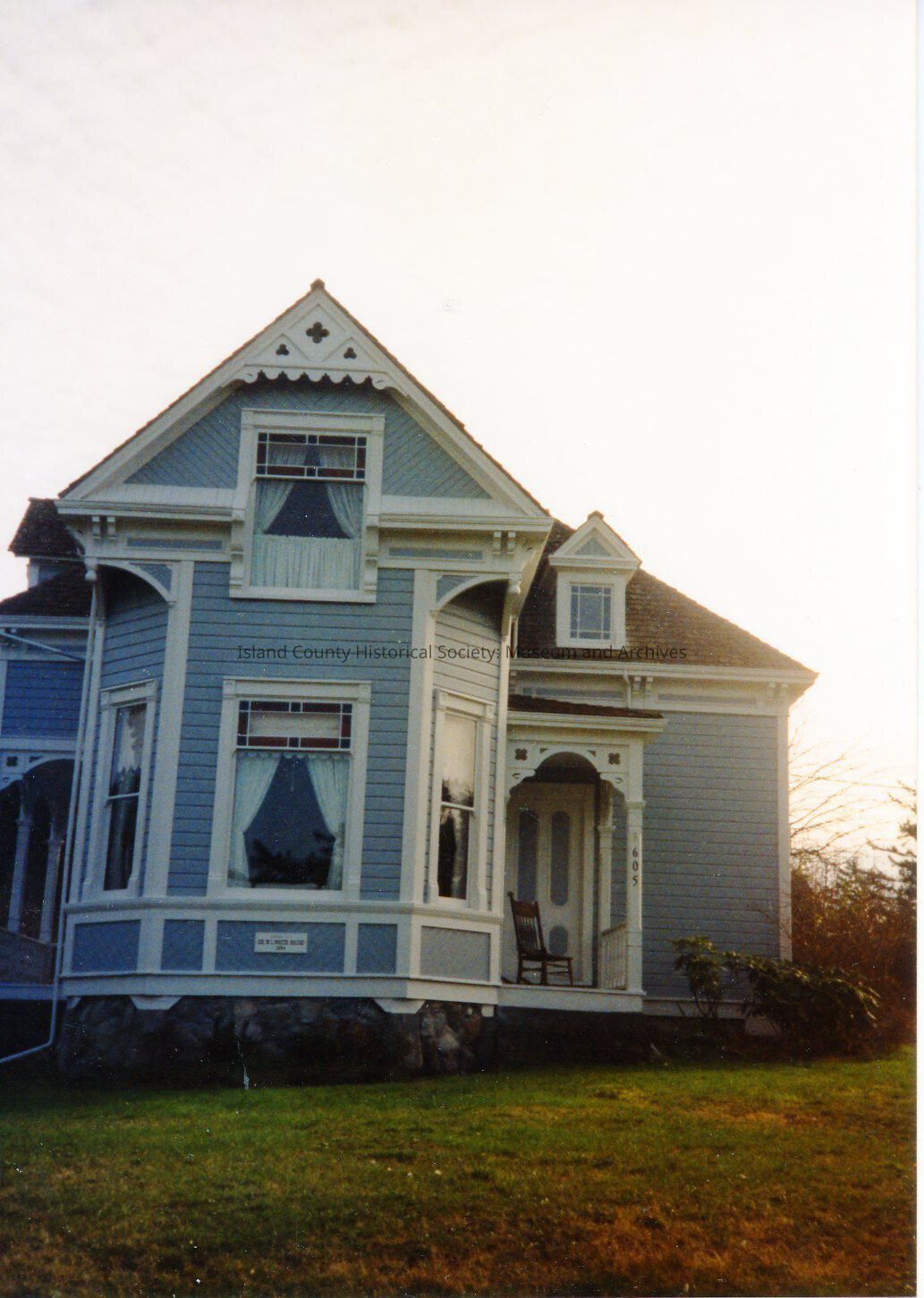 Photograph of Dr. White's house. Blue house with triangular gabled roof. Porch has a arch entry and rocking chair on it. White entry door to the home. Square windows and one gabled dormer window on the right roof line. Home also owned by Lovejoy and C. H. Lyon. Same home as pictured in 2013.205.006-008.