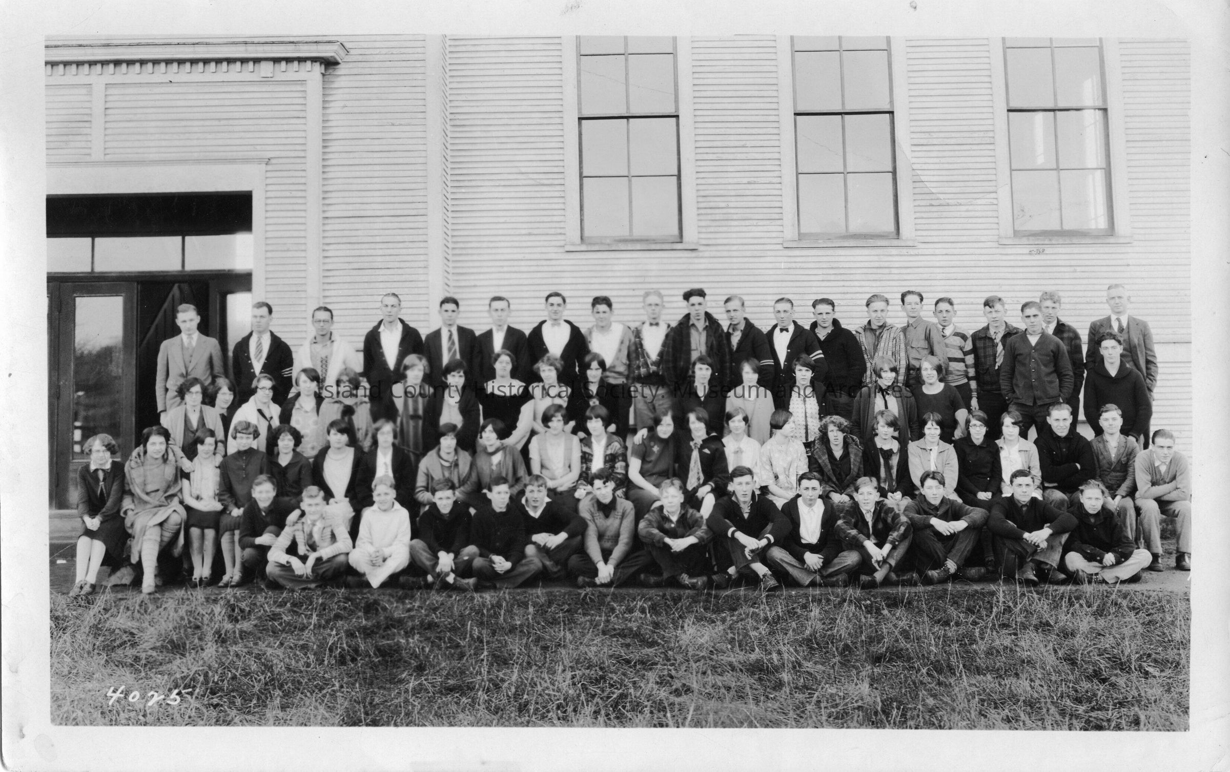 Coupeville High School students sitting and standing in front of high school in 1926-27. 70 names listed on back.