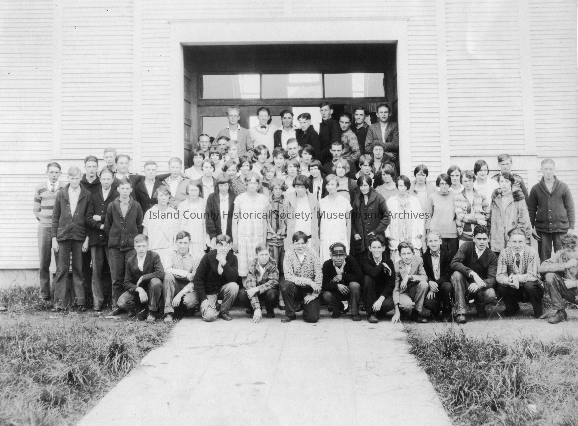 Coupeville High School students in front of school in 1929. Names listed on back by class.