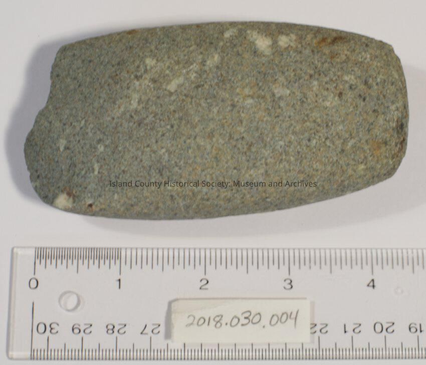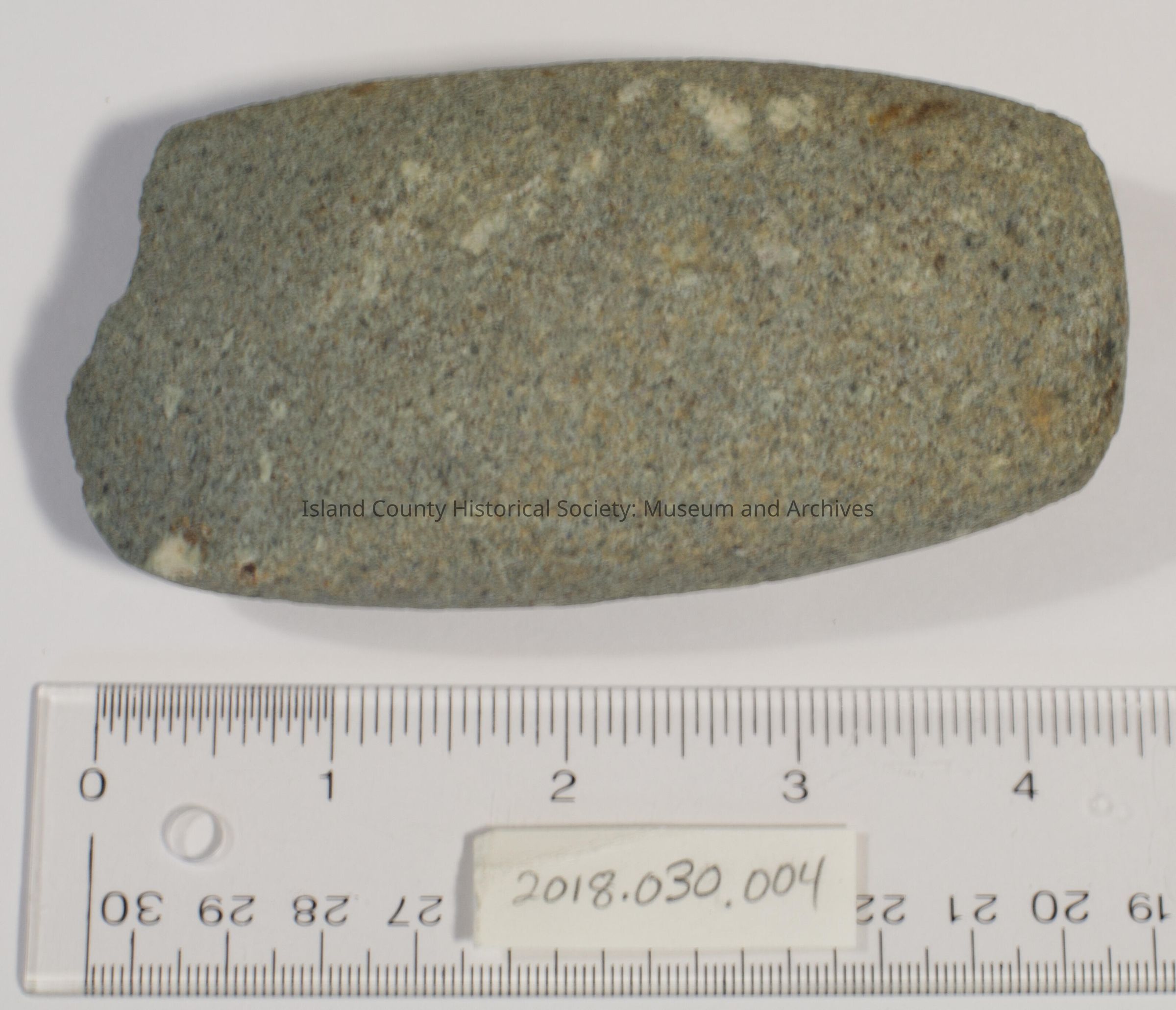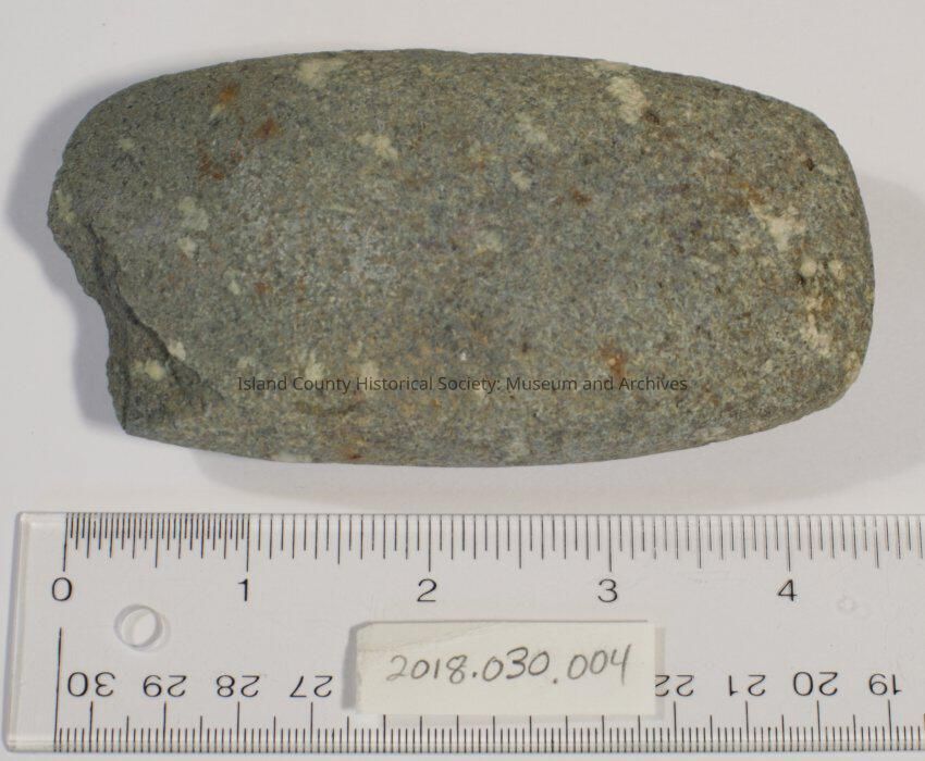 Medium gray stone tool, adz with numerous white quartz inclusions all over. Tip end has significant chunk missing.