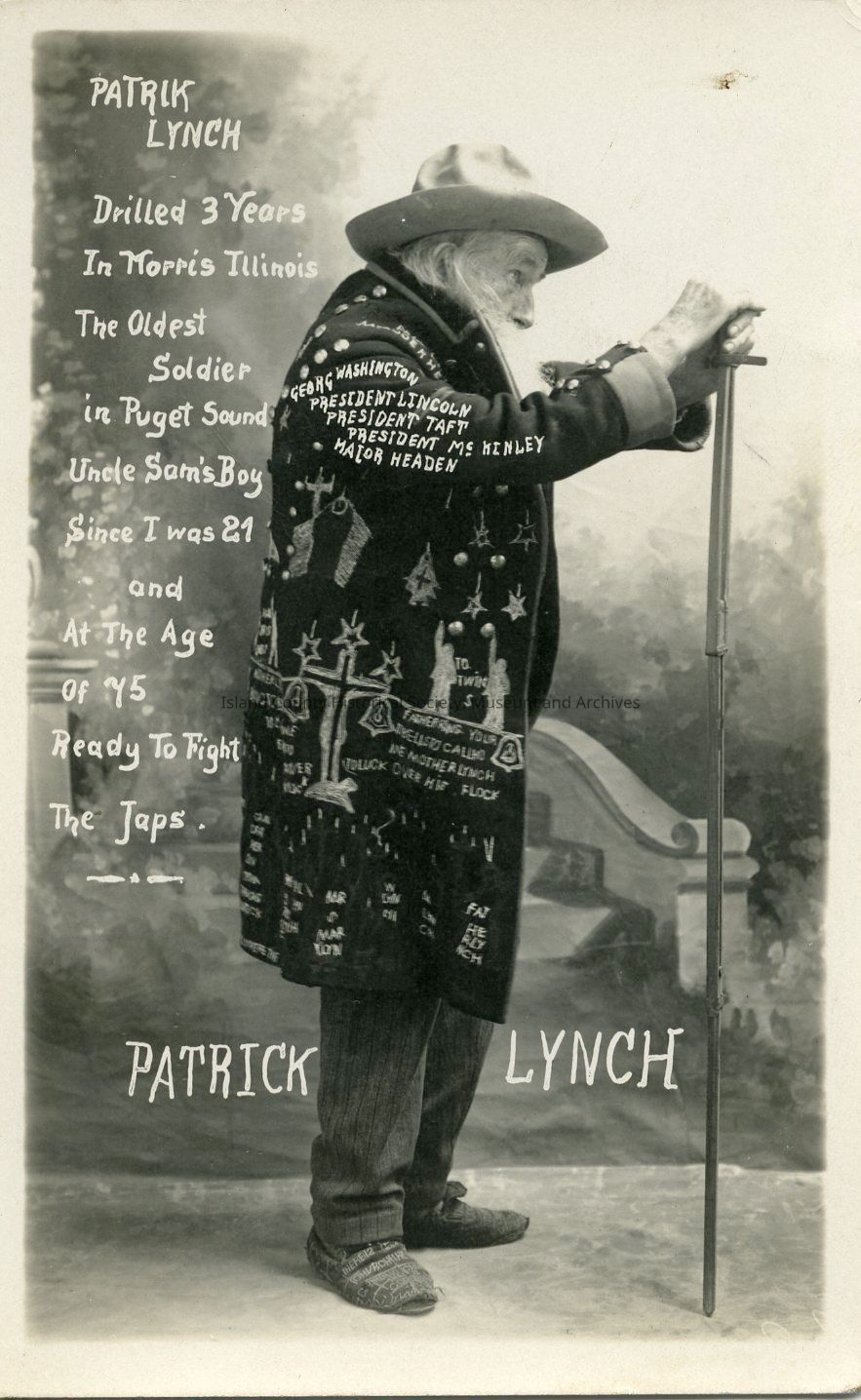 Postcard depicting Patrik Lynch dressed in a customized military-style coat, which is embroidered with various decorations and lettering, and embroidered shoes, holding a longsword. The writing on the postcard front states, "Patrik Lynch Drilled 3 Years in Morris Illinois The Oldest Soldier in Puget Sound Uncle Sam's Boy Since I Was 21 and At The Age of 75 Ready To Fight The Japs."