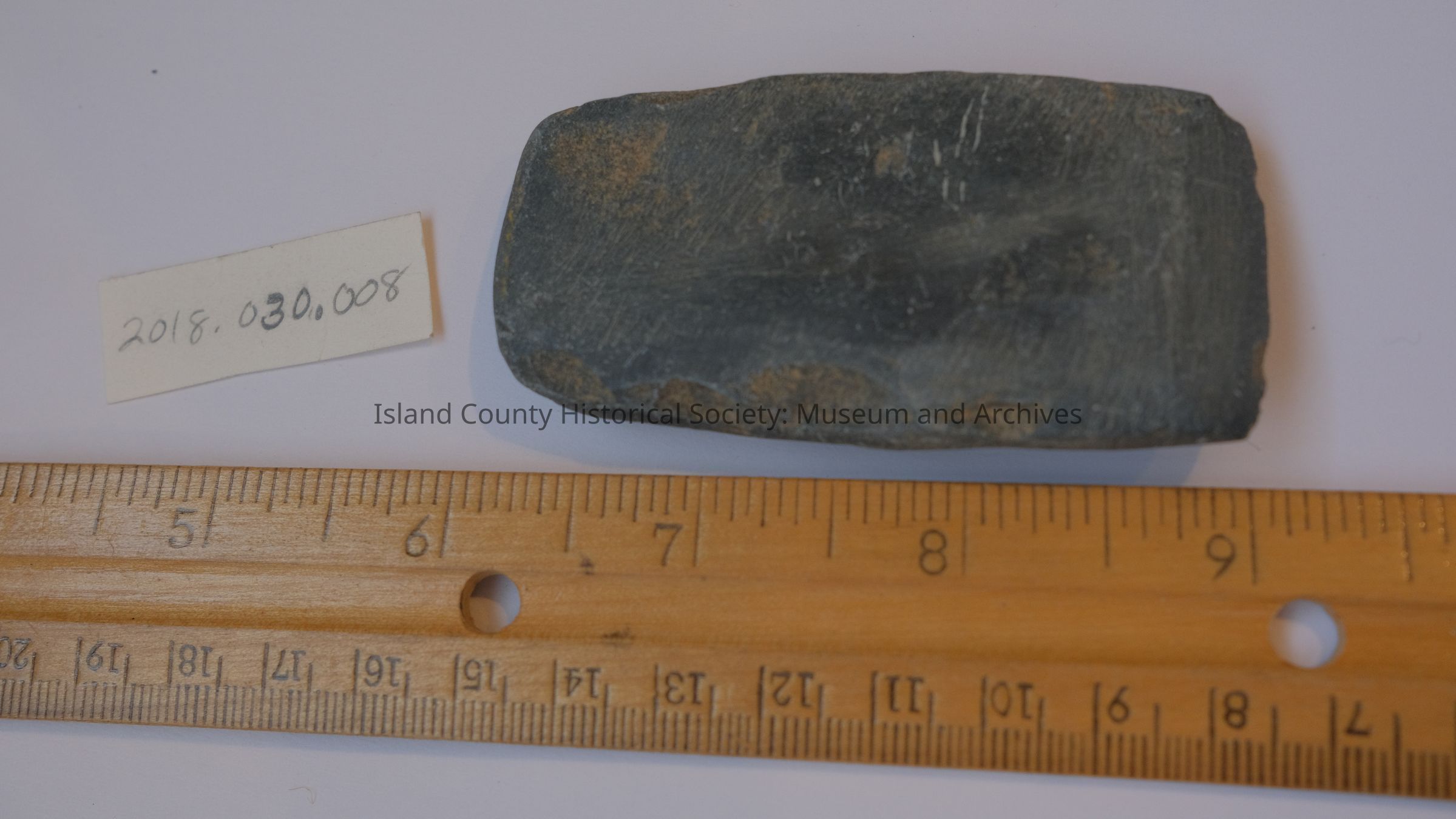 Dark gray small stone tool, adz. Fairly flat on one side with incline toward the edge of tip. One side has 4 chips. Base has 2 chips. Tip has 3 small chips on the edge.