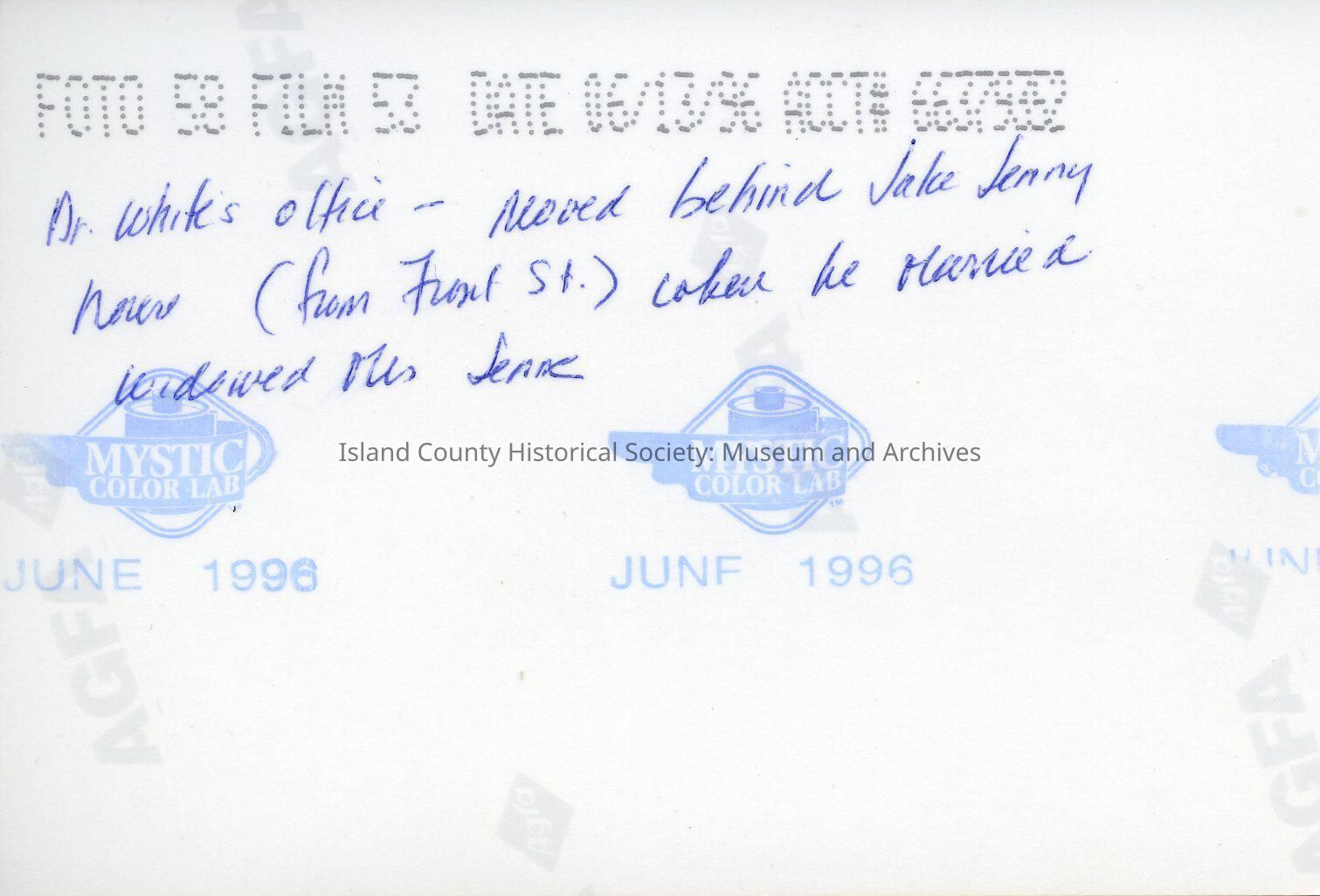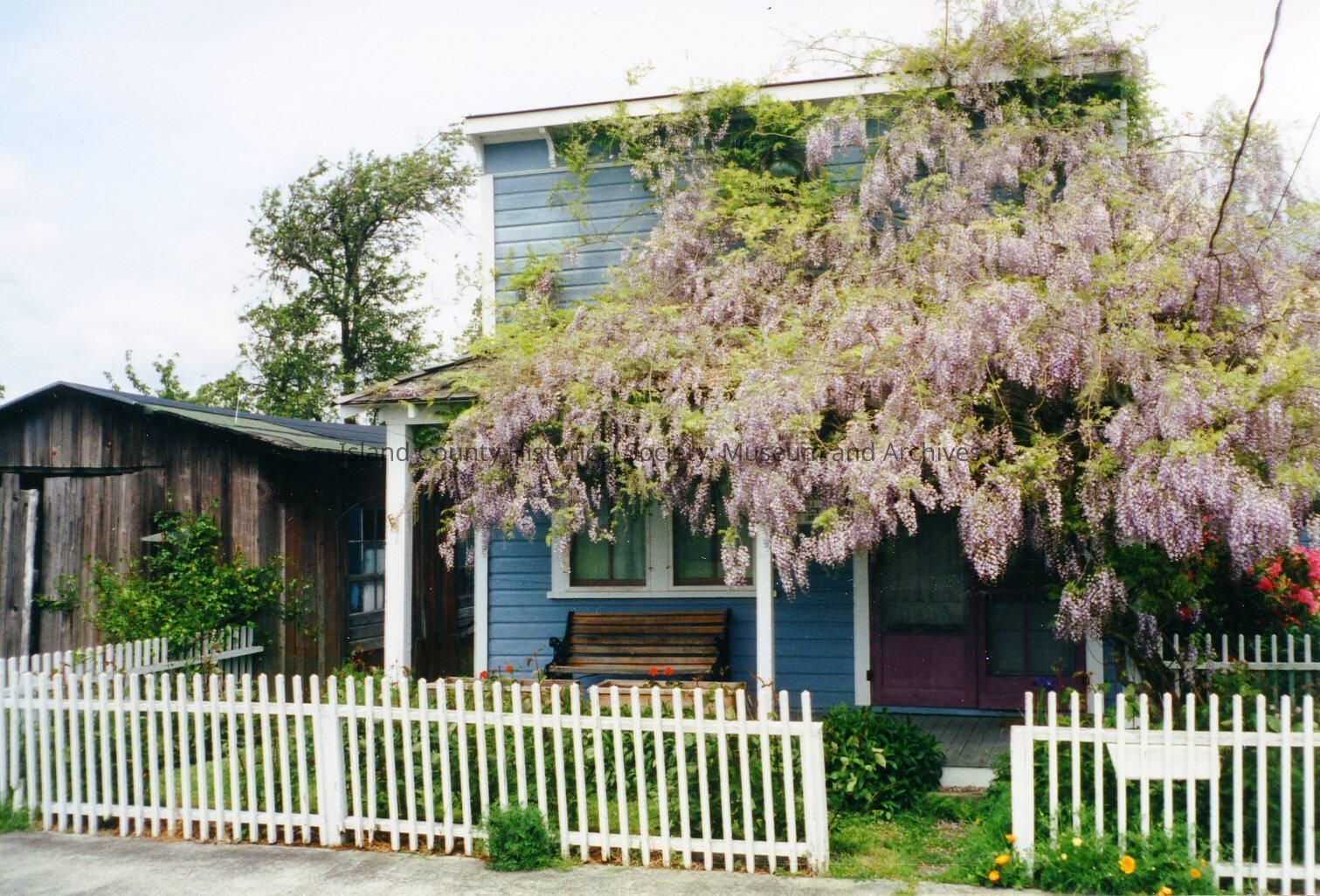 Photograph of Dr. White's office. It is a blue building with an open porch. There is a wood bench on the porch. The building is bordered by a white picket fence. To the right of the building is a free standing wood plank garage/shop/barn. The front yard has a large wisteria tree that blocks most of the office from view in the photo. The back of the picture reads "Dr. Whites office - moved behind Jake Jenne home (from Front St.) when he married (the) widowed Mrs. Jenne"