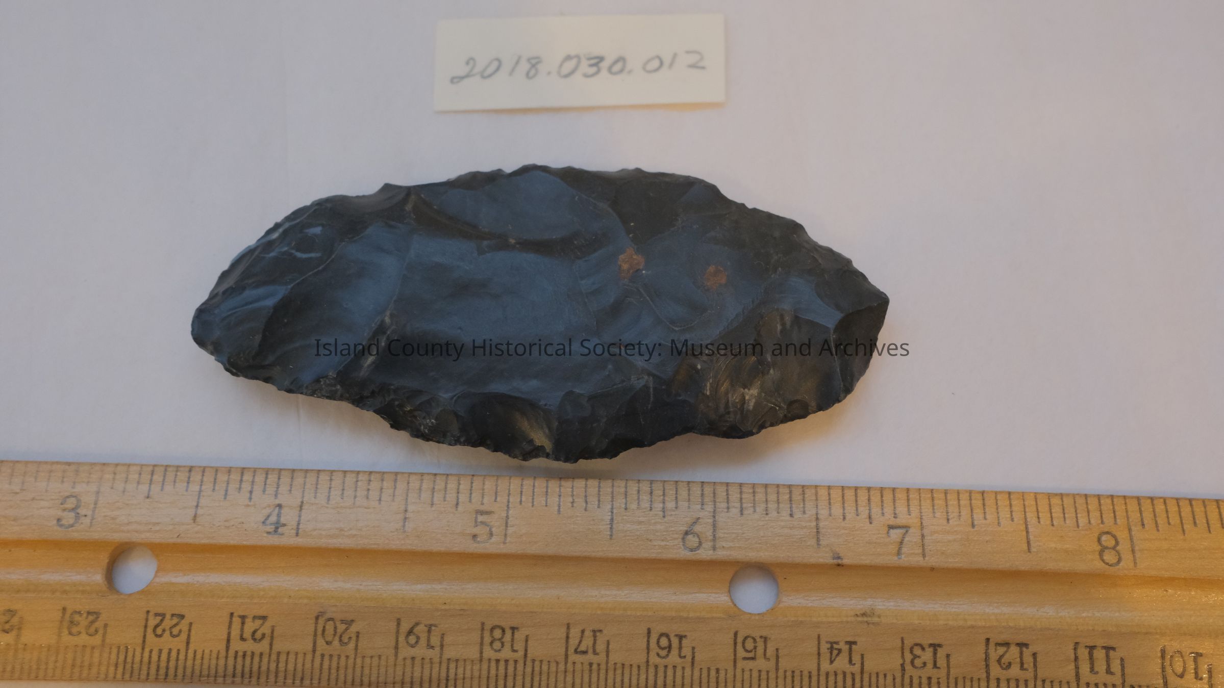 Black stone projectile. Looks like obsidian and flakes. Both sides extensively worked by flaking; edges not smooth. All side edges (blade) very sharp and rough. There are no ears on the base.