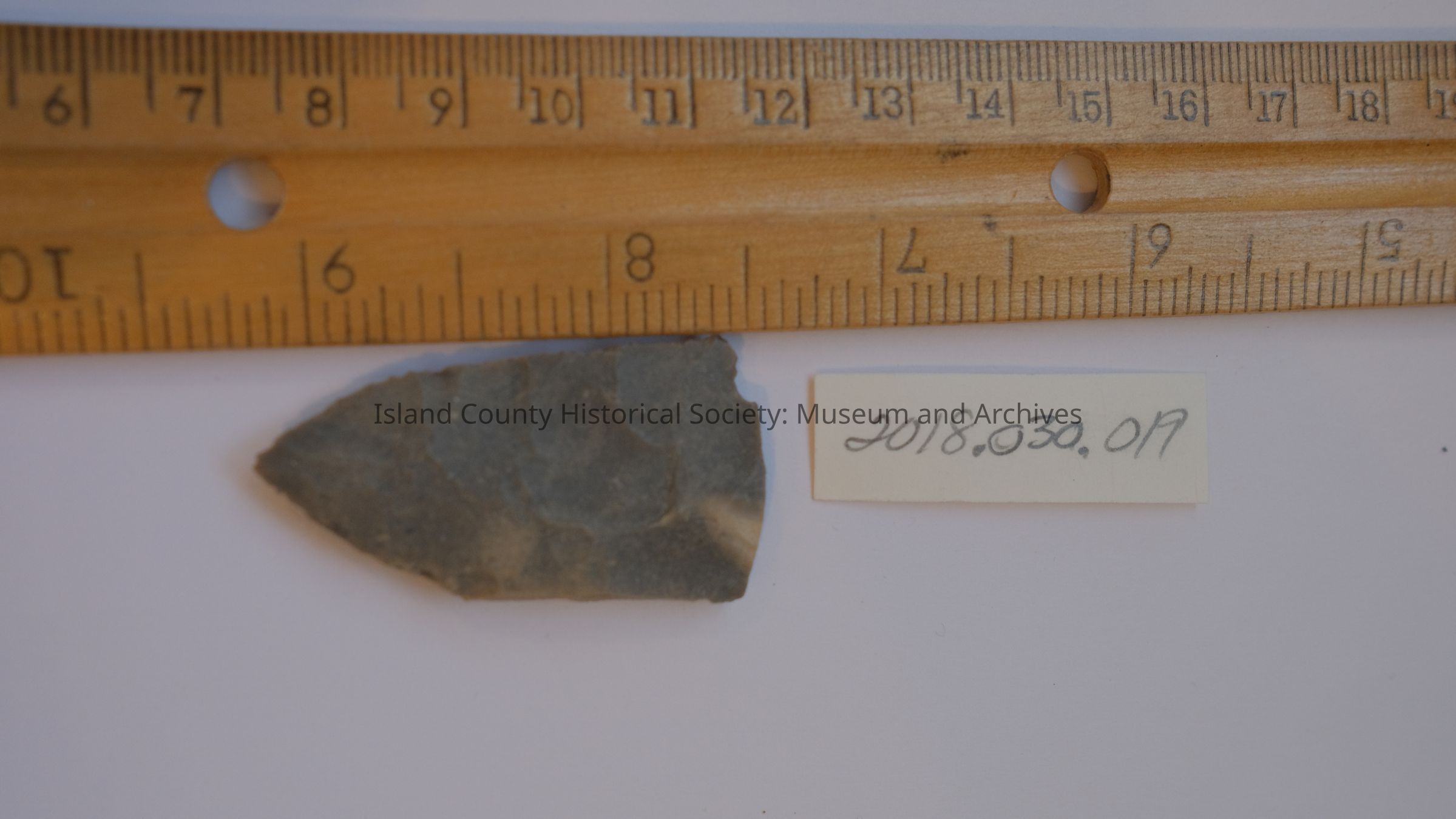 Medium gray stone projectile with small lighter colored inclusion on the base on one side. Very small. Base is missing. Tip is good, sharp. One inch of one side of the blade is missing.