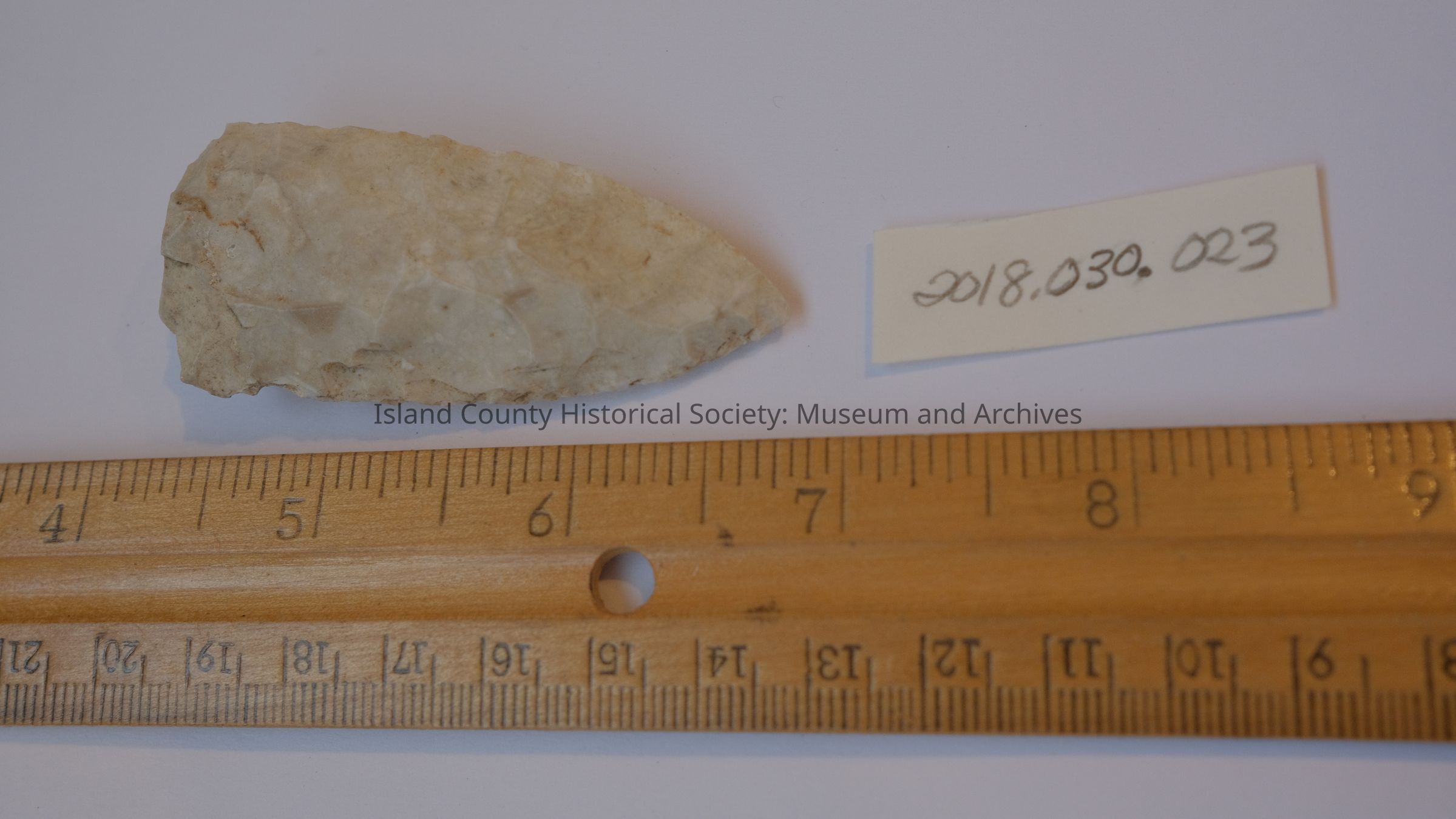 Light tan stone projectile. Base is missing. Tip is good, sharp. Thick. Lenticular (biconvex) shape.
